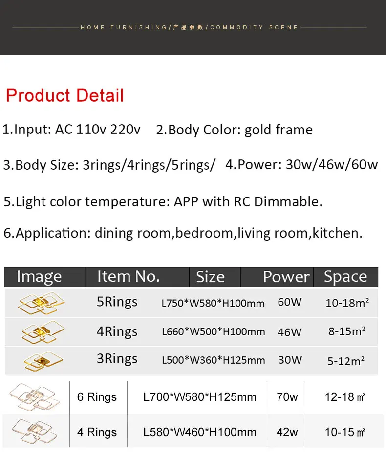 Цвет корпуса: черная оправа и белая оправаМатериал: ПВХ + алюминиевый сплав + металлический корпусПрименение: гостиная, столовая, спальня, Кухонные светильникиСветильник с регулируемой яркостью«Приложение с дистанционным затемнением»-теплый белый, естественный светильник, холодный белый в одной лампе, изменение цвета с помощью пульта дистанционного управления и управление приложением в порядкеРазмер лампы:5 стрелок/L75 * W58 * H10 см Мощность: 60 Вт пространство: 8-15 м24 дужки/L66 * W50 * H10 см Мощность: 46 Вт пространство: 5-12 м23 дужки/L50 * W36 * h12.5см мощность: 30 Вт пространство: 3-10 м26 стрелок/L70 * W58 * h12.5см мощность: 70 Вт пространство: 8-15 м24rarms/L58W46 * H10cm мощность: 42w пространство: 5-12m2