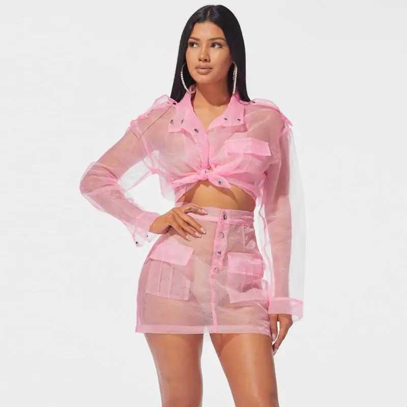 CHAOP/летние женские комплекты, розовые сетчатые сексуальные комплекты из органзы, комплект из 2 предметов, Куртка и юбка, модные Клубные наряды, Милая женская одежда, новинкаДлина одежды: короткаяДлина платья: выше колена, миниВоротник: отложной воротникТип застежки: пуговицаМатериал: полиэстерПол: Для женщинТип застежки: однобортныйСтиль: сексуальный и клубныйСтиль рукава: ОбычныйДлина рукава (см): полнаяУкрашение: КарманыНомер модели: комплект из двух предметовДлина брюк (см): шортыТип узора: однотонныйЦвет: розовыйРазмер: S,M,L,XLГод/Сезон: лето 2021