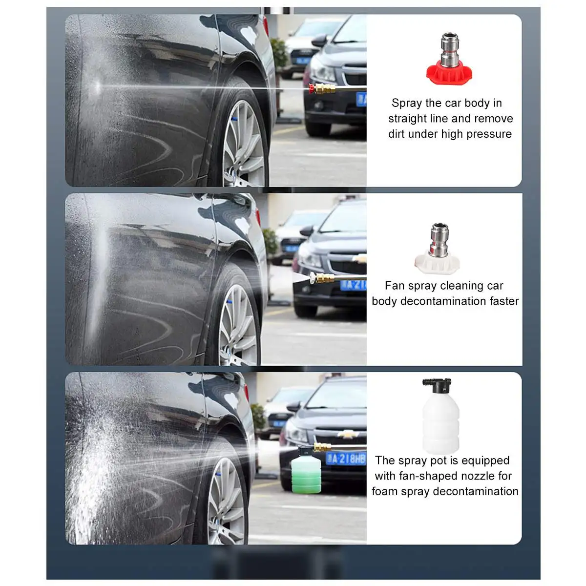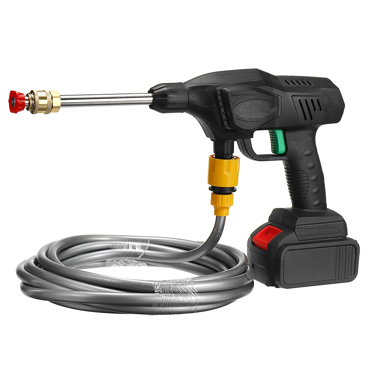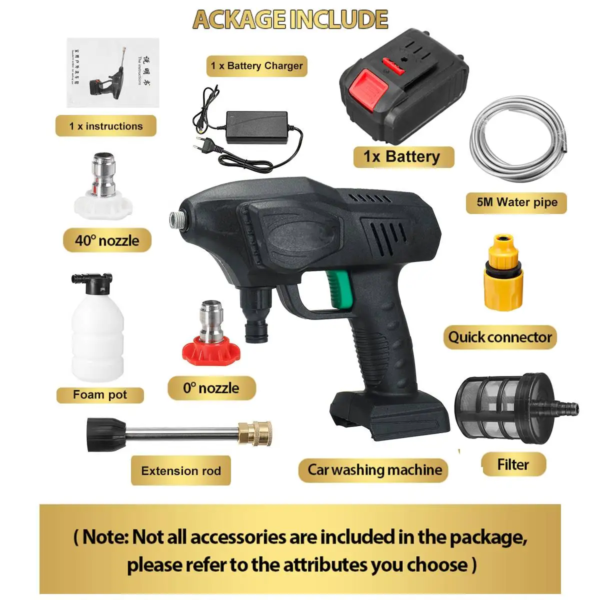 Характеристики:Название продукта: стиральная машина высокой мощности, беспроводная мойка с литиевым аккумулятором, водяной насос высокого давленияЦвет: черныйМатериалы: АБС-пластик и медьНапряжение:288VFЕмкость аккумулятора:20000 мАчМощность:500 ВтНапряжение зарядного устройства: AC 110-240V 50 / 60HzДлина водопровода: 5 мПосылка входит:1 x автомойка1x5 м водопроводная труба1 x Аккумулятор1 x Зарядное устройство (штепсельная Вилка европейского стандарта)1 удлинитель1 x насадка 0 °1x40 ° сопло1 x пенопластовый горшок1 x быстрый разъем1 Руководство по внедрениюQ и AВ1: почему стиральная машина не может запустить после включения выключателяОтвет 1: возможно, батарея разряжена, пожалуйста, зарядите ееВ2: почему после начала Мойки автомобиля вода отсутствует?О2: Наблюдайте, сгибается ли водопроводная труба, а дренаж не гладкий; Нажмите на стиральную машину более 10 секунд, а затем подождите, пока вода будет всасываться в стиральную машину автомобиляВ3: стеснение-это такое маленькое давление водыОтвет 3: давление воды. Размер насадки имеет определенную связь с насадкой, вы можете выбрать замену насадки; При использовании аккумулятора давление воды будет очень низким, пожалуйста, заряжайте.Примечание:1. Замеры сделаны вручную, поэтому возможны отклонения на 0,5-1 дюйм. (1 дюйм = 2,54 см)2. Цвет фактических элементов может немного отличаться от изображений из-за различий в экранах компьютера, спасибо за понимание. 1 x стиральная машина для автомобиля