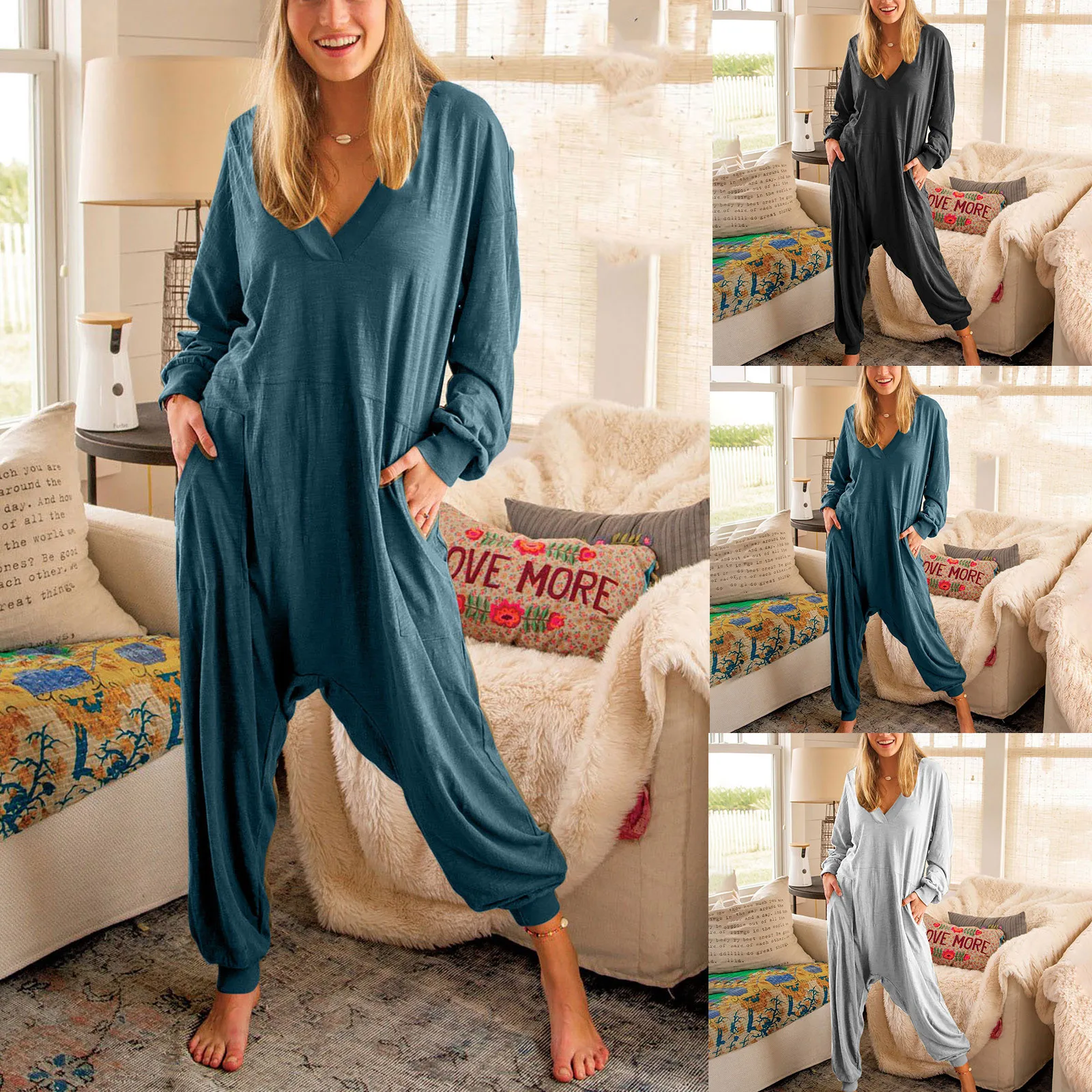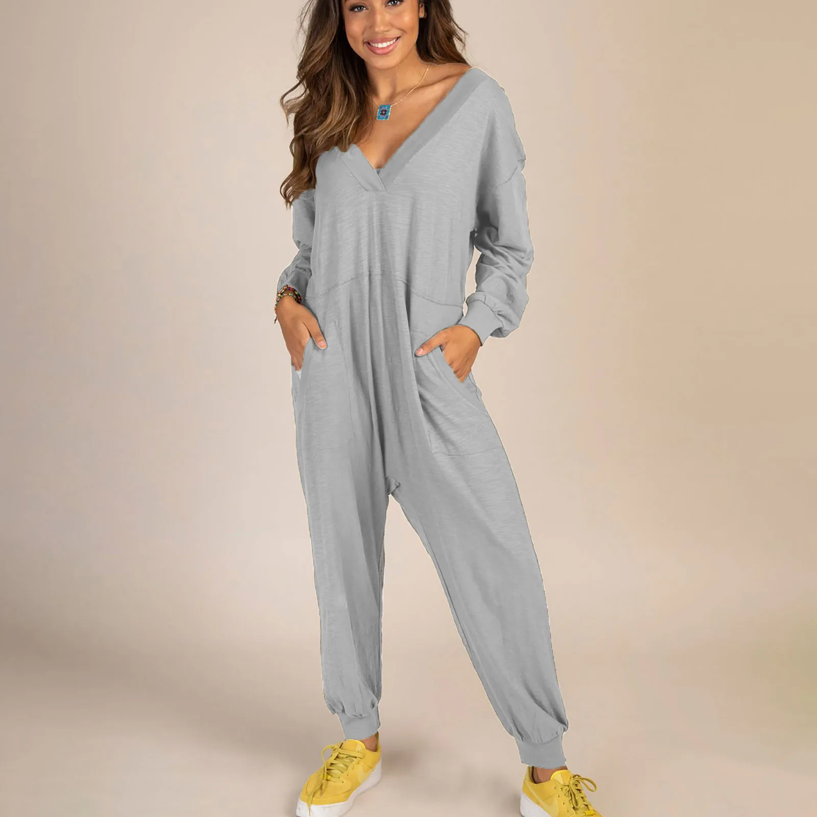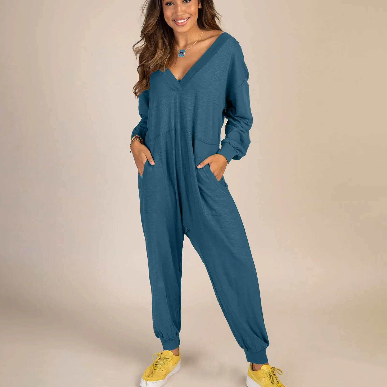 Комбинезон женский, летний, однотонный, с V-образным вырезом и длинным рукавом