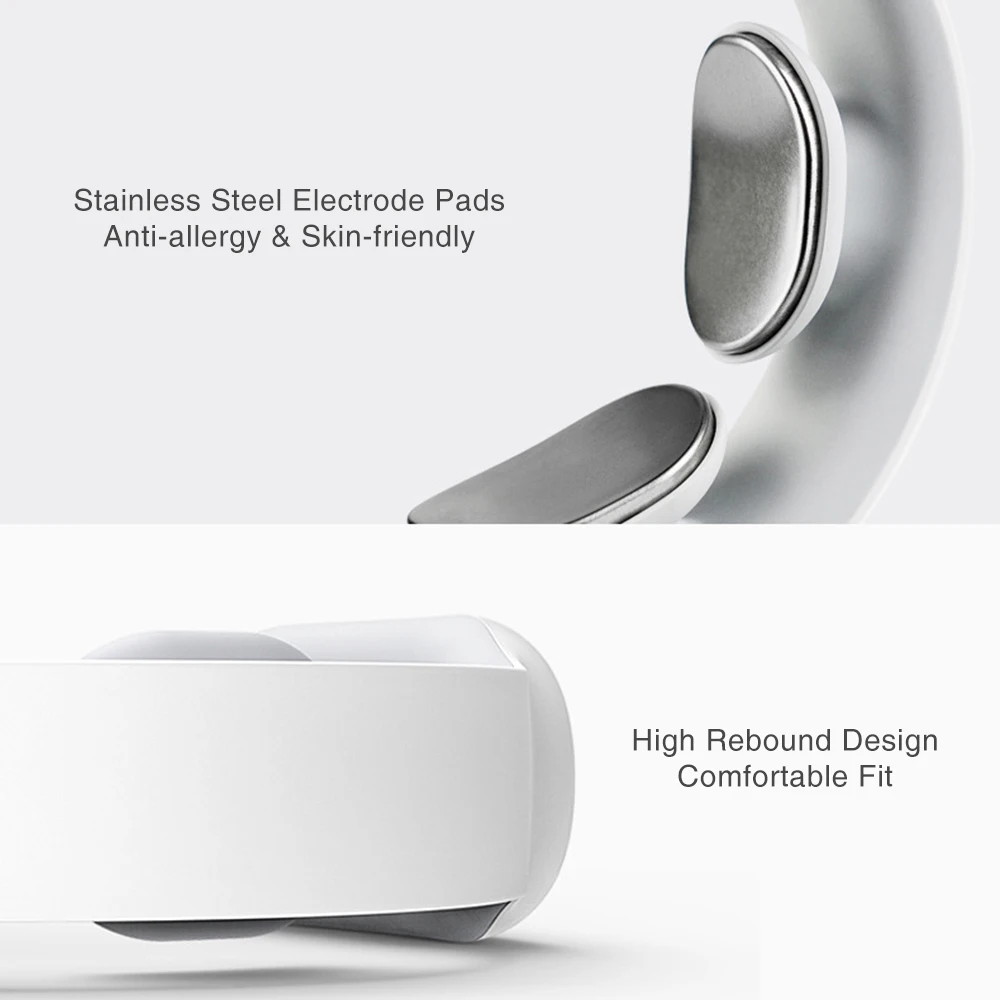 [Эргономичный комфорт при ношении] силиконовый материал, благоприятный для кожи, обеспечивает гладкое и мягкое прикосновение к телу, а электродные накладки из 304 нержавеющей стали идеально подойдут к изгибу шеи с заботой.