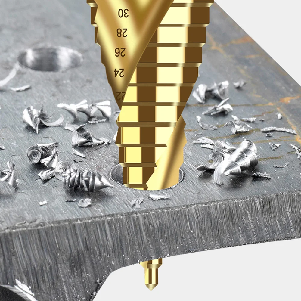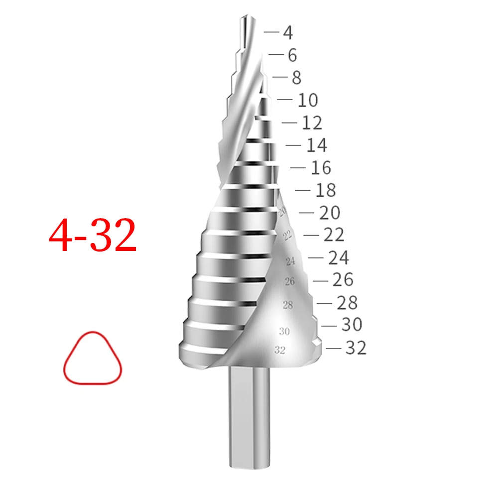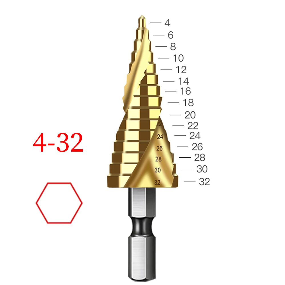 1 шт., размер: 4-32 мм HSS Спиральная рифленая Титан покрытием Шаг сверло высокого Скорость Сталь металлический древесный Дырокол Конус Буровой инструмент