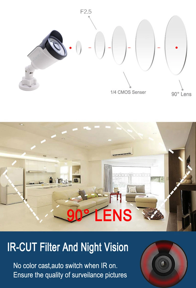 1.HD-камера 2. Разрешение: 960H / 1080P / 4MP / 5MP 3,24 шт. ИК-светодиодов с расстоянием 5-25 м ИК 4. Встроенный фильтр IR-CUT, дневное и ночное видение 5. Высококачественный чехол из АБС-пластика, используется внутри/снаружи, водонепроницаемый IP66 6. Стандартный объектив: HD 3,6 мм объектив (6 мм объектив опционально). 7.AHD (аналоговая Высокая четкость), новый формат видео для улучшенной передачи видео CVBS (COMET *) и HD. 8. HD AHD-камера является стандартом передачи аналогового HD-видео через коаксиальный кабель, что позволяет передавать HD на большие расстояния по более низкой цене для соответствия требованиям для сложной и крупной установки. 9. Обычно используется коаксиальный кабель, SYV-75-5 кабель может передавать видео более 500 метров. 10. Необходимо работать с AHD DVR 11. Лучший выбор для реконструкции проекта. 12. Вы можете обновить старую аналоговую систему безопасности до HD-камер без изменения кабельных маршрутов. *** P.S: перед заказом убедитесь, что у вас есть видеорегистратор, который поддерживает AHD. Нормальный видеорегистратор не поддерживает AHD-камеры. Карта видеозахвата не поддерживает AHD-камеру, не поддерживает прямое подключение к телевизору При заказе, пожалуйста, подтвердите необходимую Вам систему камер, например PAL или NTSC, что очень важно. Некоторые видеорегистраторы AHD поддерживают изменение формата камеры, например: XM AHD DVR, вы можете изменить его в меню или связаться с нами
