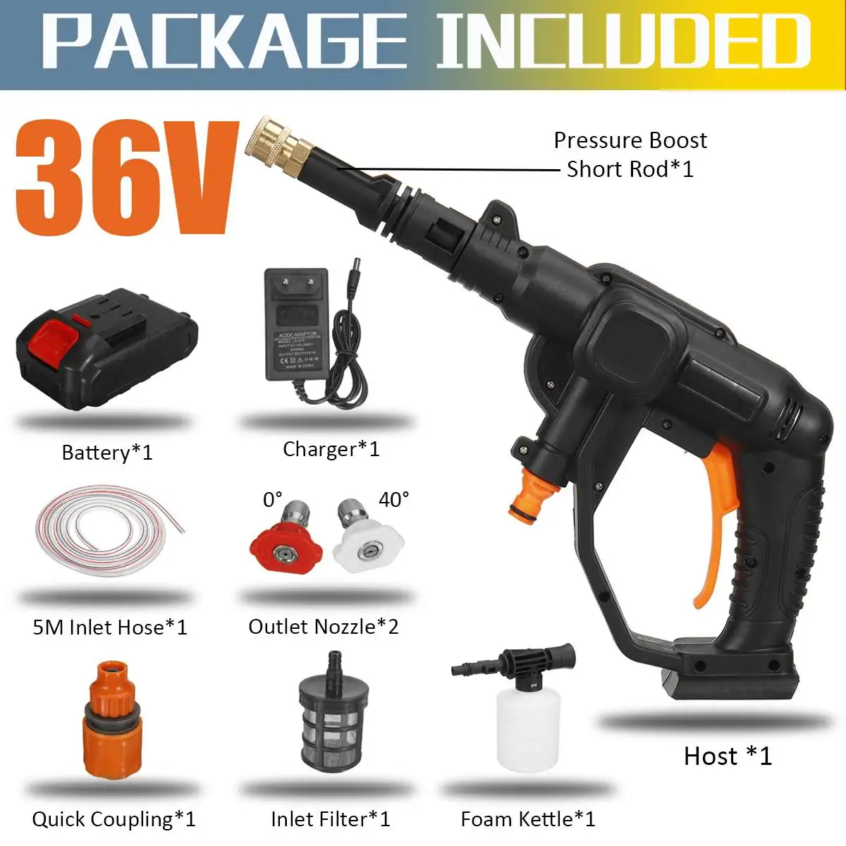 Е-байка 36В посылка включает в себя:1 х Портативный очиститель давления1x36V Батарея пакетЗарядное устройство-1 шт.1 х 5 м впускной шланг1 х штанга для увеличения давления1x0 ° выпускное сопло1x40 ° выпускное сопло1 х входной фильтр1 x быстрое соединение1 х пенопластовый чайник1 x Руководство пользователя