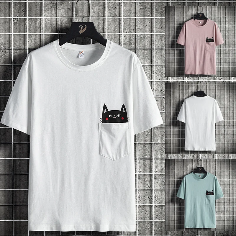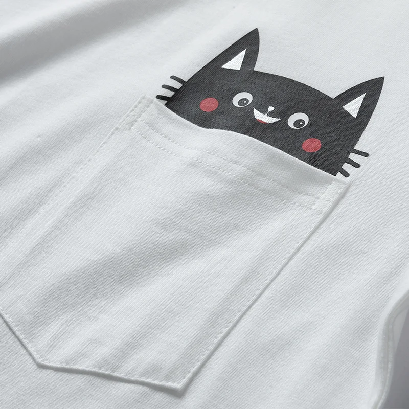 Футболка с принтом Black Cat, Мужская футболка с карманом, мужские винтажные корейские топы, удобные футболки, мужские