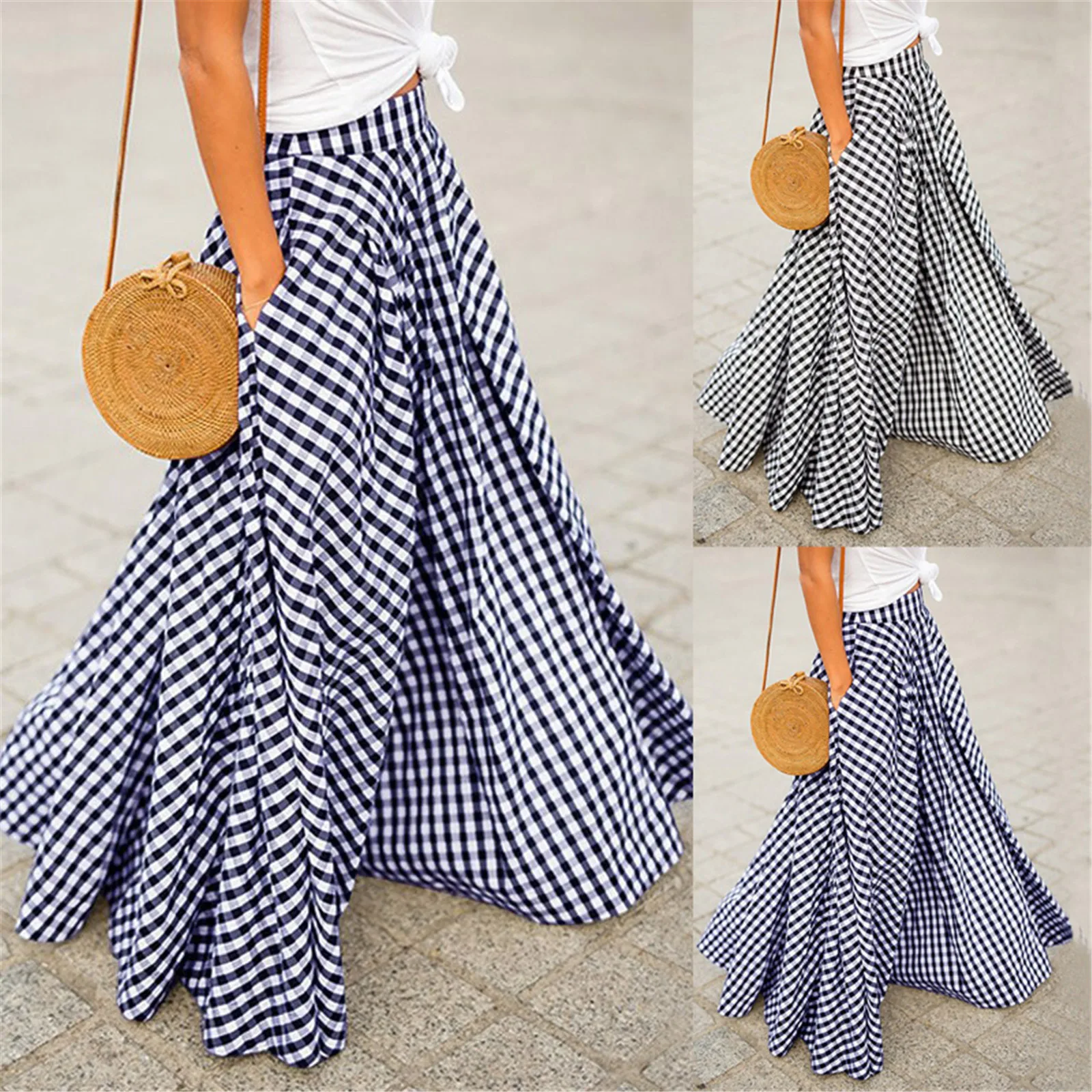 Женская клетчатая юбка с карманами, 58 #, элегантная длинная юбка с большим подолом, с высокой талией и карманами, уличная одежда в стиле Харадзюку