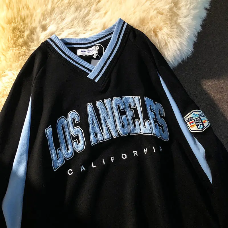 Женский свитер оверсайз с длинным рукавом, винтажный брендовый Повседневный Спортивный Топ для подростков с буквенной вышивкой и V-образным вырезом, весенний