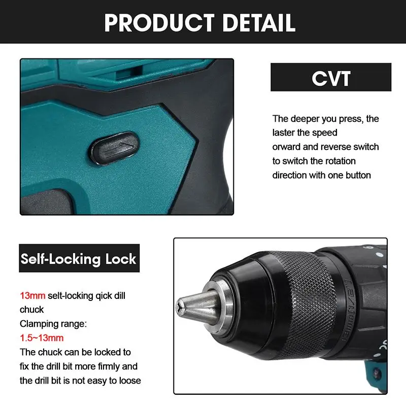 Особенности:-Встроенный светодиодный светильник, обеспечивает освещение в темных пространствах во время работы.-Эргономичная удобная ручка обеспечивает идеальный баланс и контроль инструмента.-Переключатель вперед/назад/замок, поддержка движения вперед/назад и безопасная блокировка.-Функция плоского сверла-Мощная электрическая дрель, многофункциональная, супермощная.-Высокоэффективный двигатель, обеспечивает до 25-90 Н. М крутящего момента и 4500 об/мин скорости.-2-переменной скоростью, для широкого спектра применения.Примечание:1. Допускается погрешность в 1-2 см из-за ручного измерения.2. Цвета могут отличаться, так как на дисплее разница, пожалуйста, поймите.