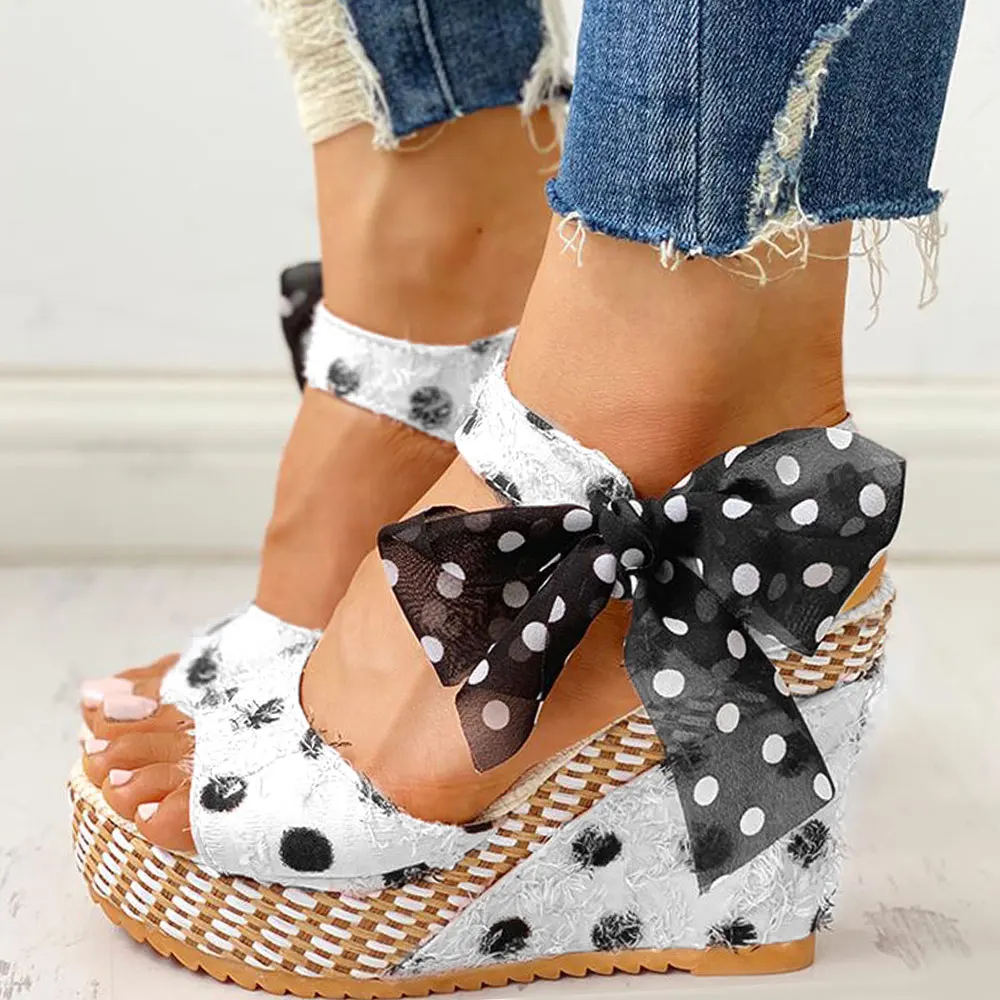 Сандалии женские на очень высокой танкетке, удобные туфли с цветочным принтом и бантом-бабочкой, милые элегантные босоножки с фруктами в горошек, лето