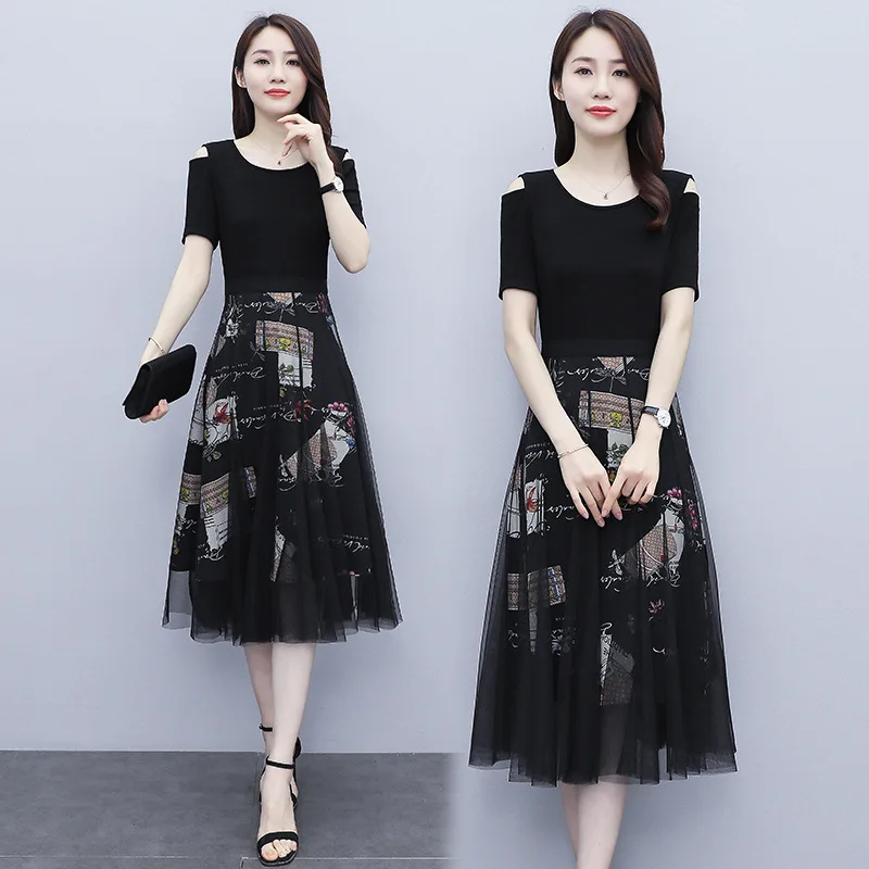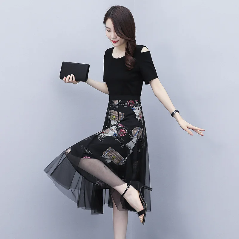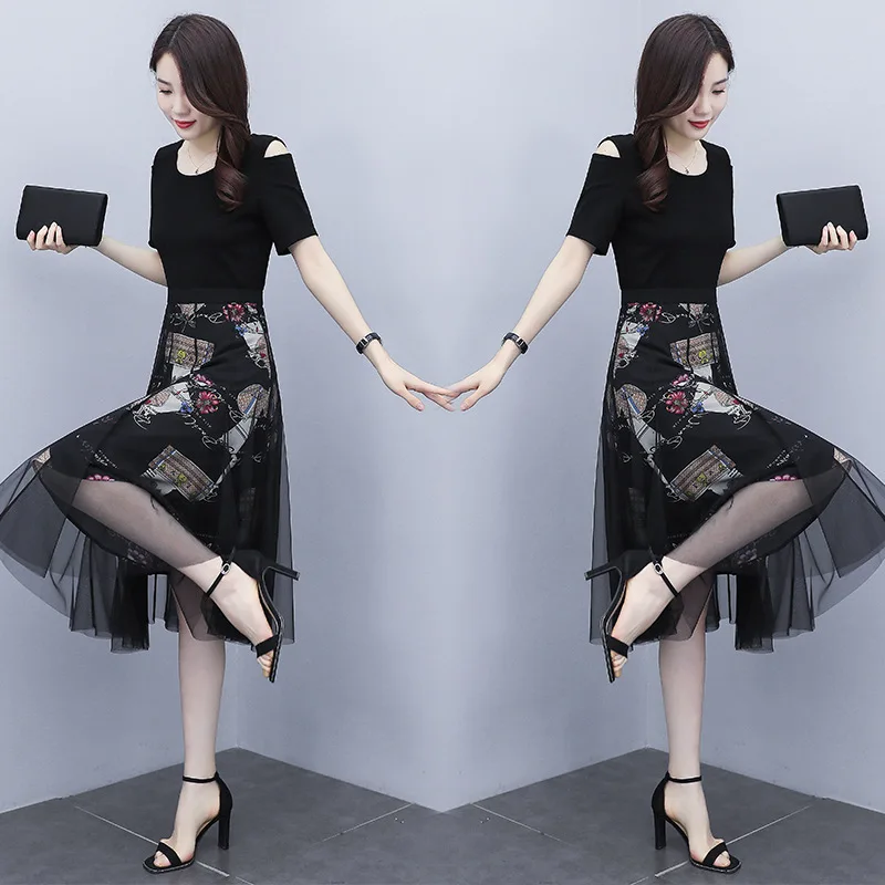 Женское платье с юбкой, с завышенной талией и коротким рукавом, комплект из двух предметов, тонкая черная сетчатая длинная юбка, Повседневное платье, лето M-3XL