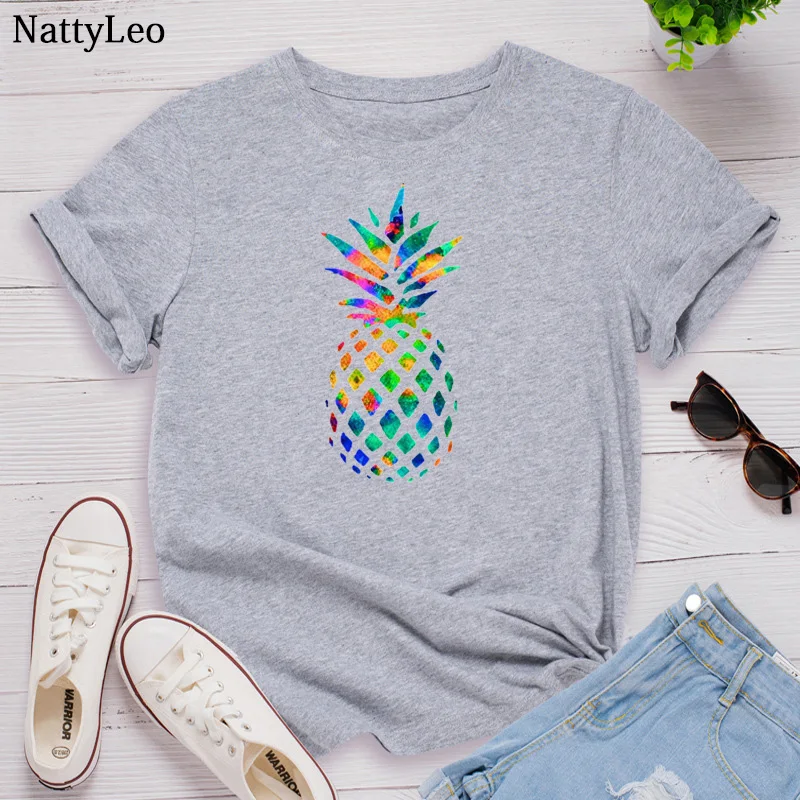 Футболка женская с принтом ананаса, размера плюс хлопок, Модный повседневный топ с круглым вырезом и коротким рукавом, уличная одежда, лето 100%