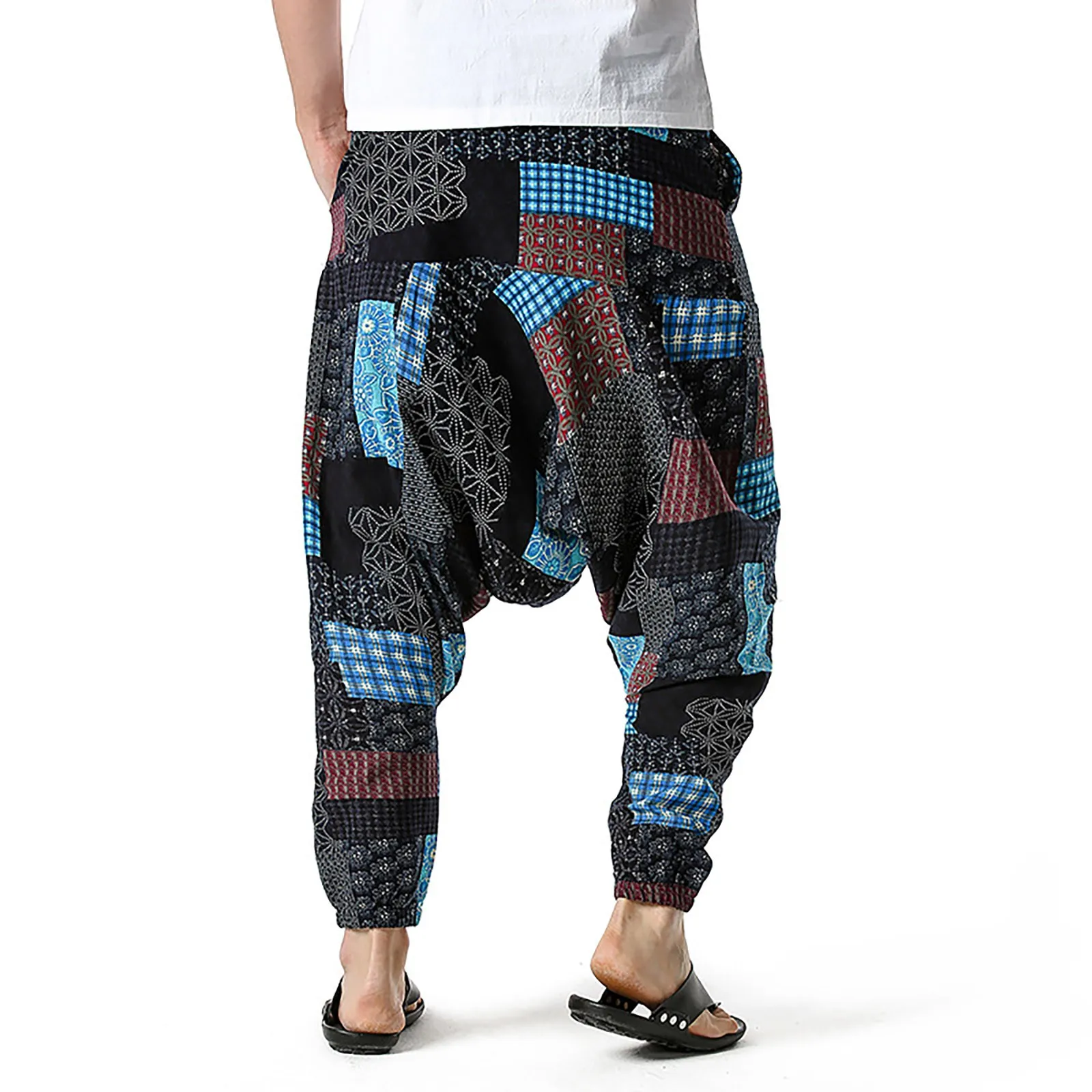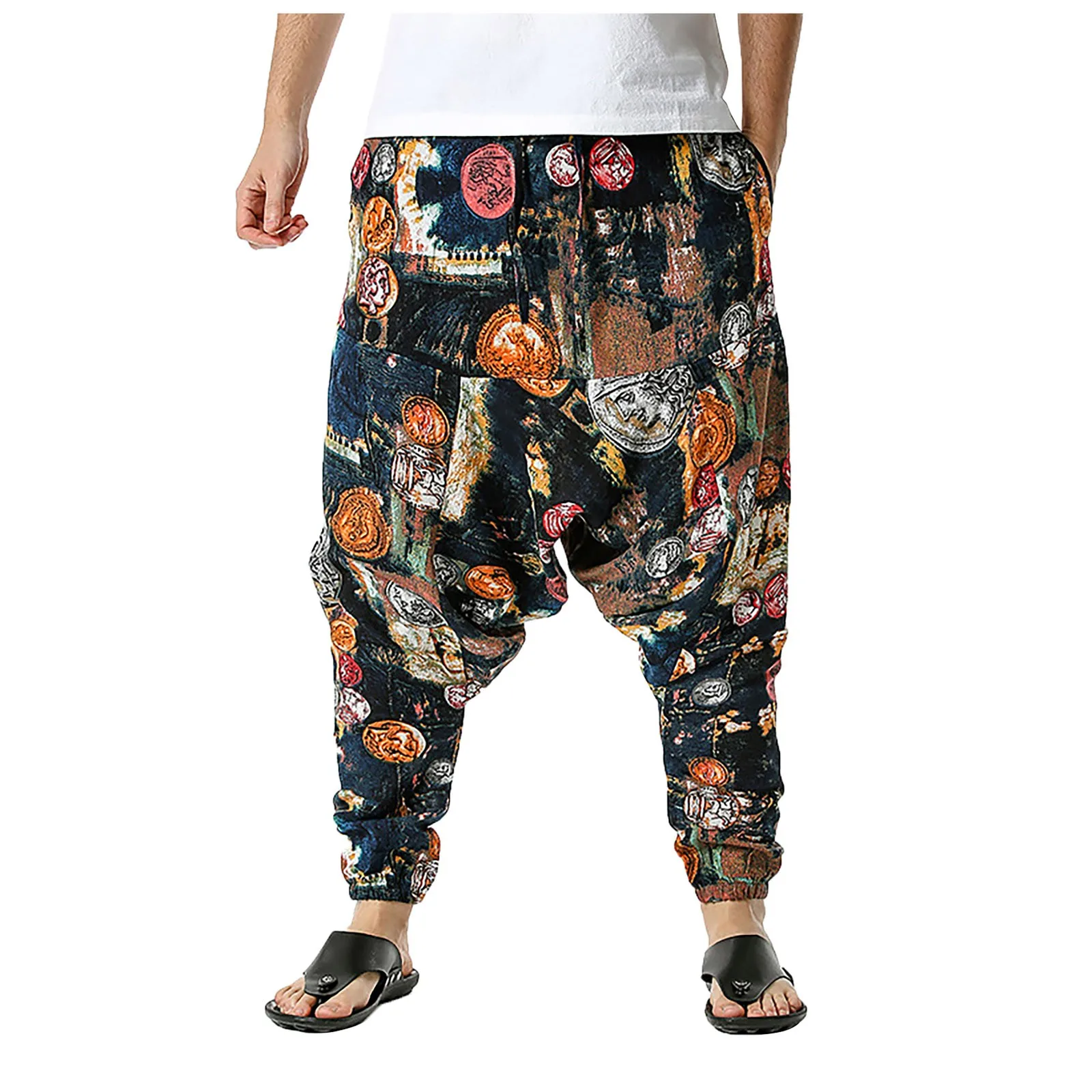 Брюки мужские с богемным принтом, уличная одежда, свободные штаны-султанки из хлопка и льна, модные брюки с Кулиской в стиле Харадзюку, весна-лето