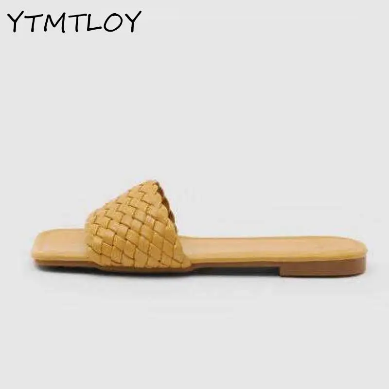 Женские плетеные шлепанцы, повседневная обувь на плоской подошве, квадратный носок, без застежки, пляжные сандалии и тапочки, лето 2021