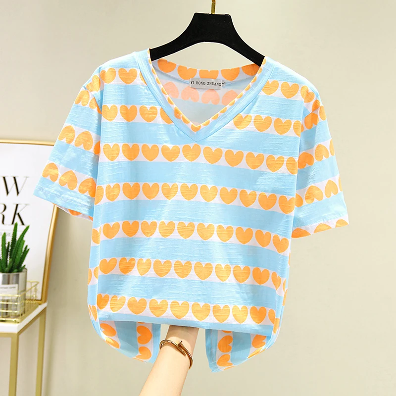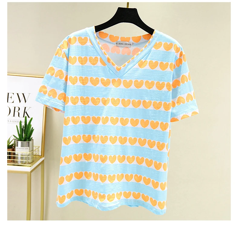 Летняя новая мода корейская креативность Love полосатая футболка с короткими рукавами с принтом женские свободные повседневные женские топы с v-образным вырезом