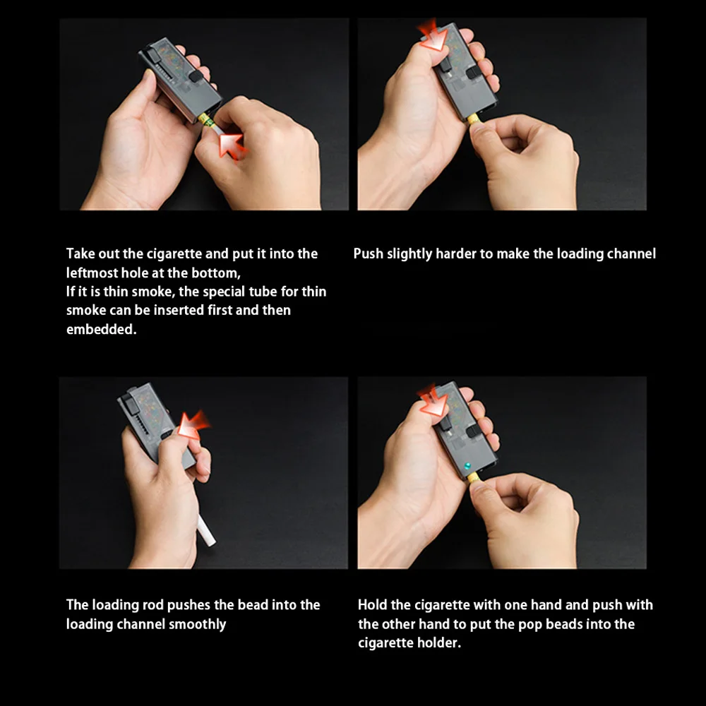 【 STEP1 】Выньте обычные сигареты, которые не были предварительно встроены с разрывными бусинами и поместите их в нижнее отверстие. Нажмите на палочку и вставьте его в мундштук, чтобы сделать канал наполнения. Стержень для наполнения плавно толкает ароматные бусины в канал наполнения.【 STEP2 】Удерживайте сигарету в одной руке и прижмите бисерную палочку другой рукой для имплантации ароматных бусин в мундштук. Прижмите и взрывайте бусинки для благовоний. Зажигание завершено, и дым бисера становится взрывоопасным в считанные секунды.【PORTABLE】Легче, меньше и безопаснее. Вы можете легко использовать его только одной рукой. Хранение его в кармане для использования на ходу или упаковки для кухни, на открытом воздухе, пеших прогулок.【GREAT GIFE IDEAS】Тренч премиум-дизайна упакован в изысканную и элегантную подарочную коробку, которая является идеальным подарком для ваших друзей и семьи в любых случаях, таких как бизнес, день рождения, свадьба, день отца, годовщина, день благодарения, Рождество и т. Д.