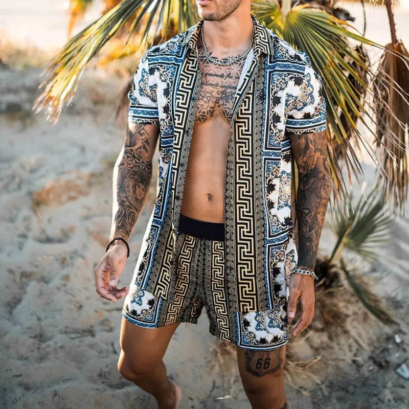Мужская рубашка с коротким рукавом и принтом в европейском и американском стиле на пуговицах + пляжные шорты для путешествий, новая летняя модная мужская рубашка с коротким рукавом