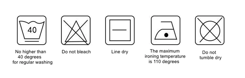 Стирка при температуре не выше 40, не использовать отбеливатель, ручная стирка, машинная стирка, не замачивать.