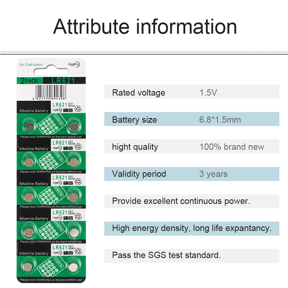 10 шт.упак. AG1 LR621 SR621 164 аккумуляторы таблеточного типа LR60 164 364A ячейки щелочной Батарея 1,55 V TR621SW 364 для MP3 игрушки часы