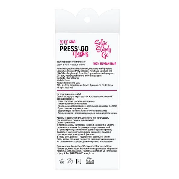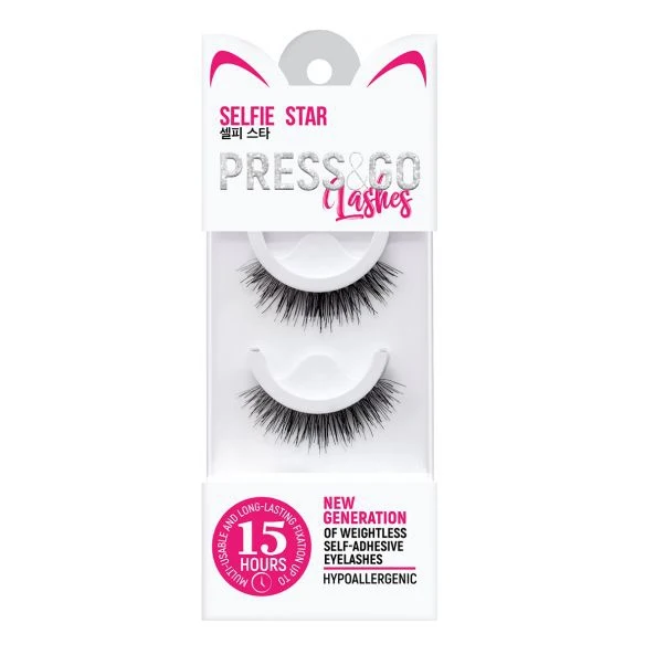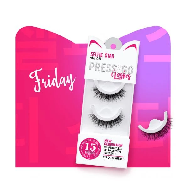 Менять свой образ каждый день и быть готовой к идеальному селфи – задача посильная для Press&Go. Ресницы Press&Go от молодого корейского бренда Selfie Star созданы специально для ярких и динамичных людей. Больше не надо тратить много времени на аппликацию накладных ресниц. Просто достань ресницы, приложи их к линии роста натуральных ресниц и прижми. Готово! Идеально! На самоклеящиеся ресницы Press&Go уже нанесена гиппоалергенная клеевая основа! Длительная фиксация до 15 часов, яркий взгляд и комфорт в носке обеспечены. Их легко наносить, они не ощущаются на глазах, отлично держатся и легко снимаются. Снять реснички? Проще простого – достаточно потянуть за внешний уголок, никаких специальных средств не требуется. Многоразовое использование до 4 раз. Модель Friday с ресничками чередующейся длины подойдет для создания яркого образа с акцентом на глазах для веселой и долгожданной пятницы! Длина ресниц увеличивается от внутреннего уголка глаза к внешнему –взгляд ярче и объемнее.