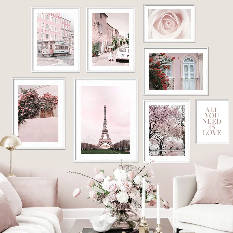 Настенная картина с изображением Парижа, башни, сакуры, дерева, автобуса, террасы, девушек, постеры и принты на холсте в скандинавском стиле, настенные картины для декора гостиной