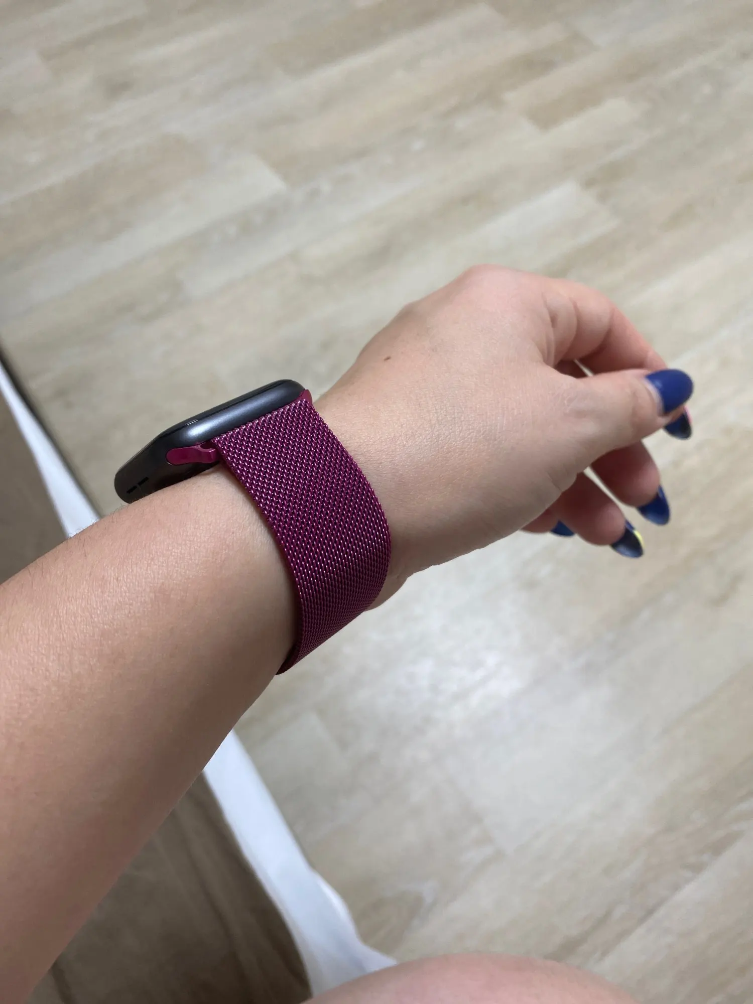 Хороший ремешок, не тяжелый, магнит на первый взгляд держит хорошо, посмотрим как будет в носке. Цвет яркий, изготовлен качественно, запаха нет. На запястье 16 см L более, чем достаточно, почти в полный двойной обхват. С продавцом не общалась. Рекомендую к покупке.