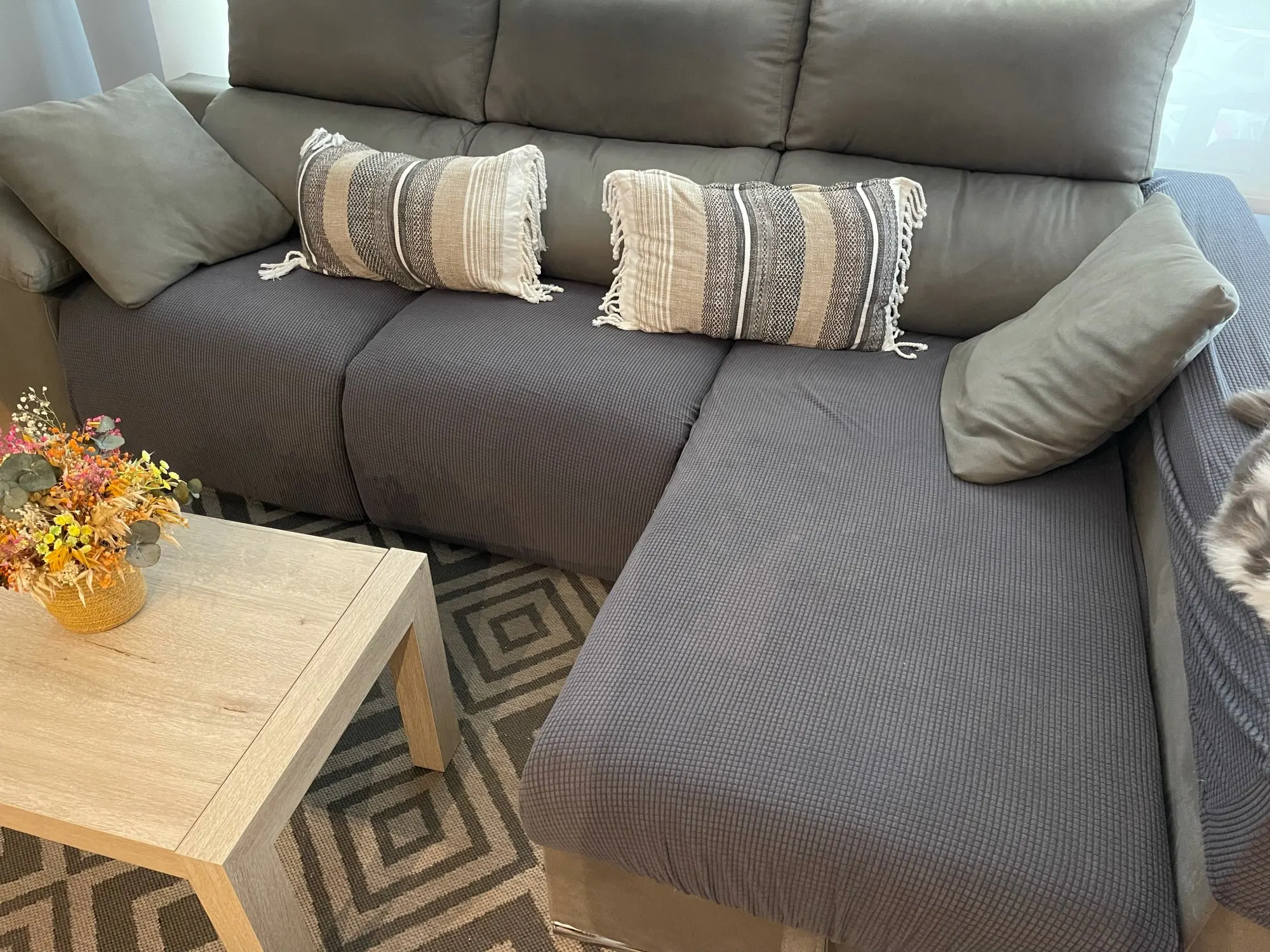 Он очень хорошо сидит, он эластичный и бархатистая текстура, очень красивый темно-серый цвет. Легко разместить и удалить, я вижу это идеально, если у вас есть домашние животные, я сразу удаляю волосы с моей кошки, и она стирается в стиральной машине без проблем. Я рекомендую это, отличная цена и качество