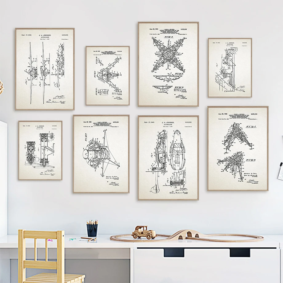Настенная Картина на холсте самолёт со спутником Механическая схема скандинавские постеры и принты настенные картины для декора гостиной