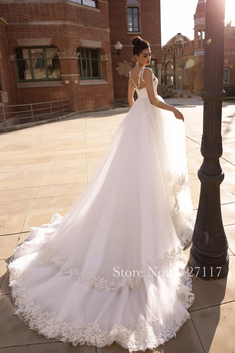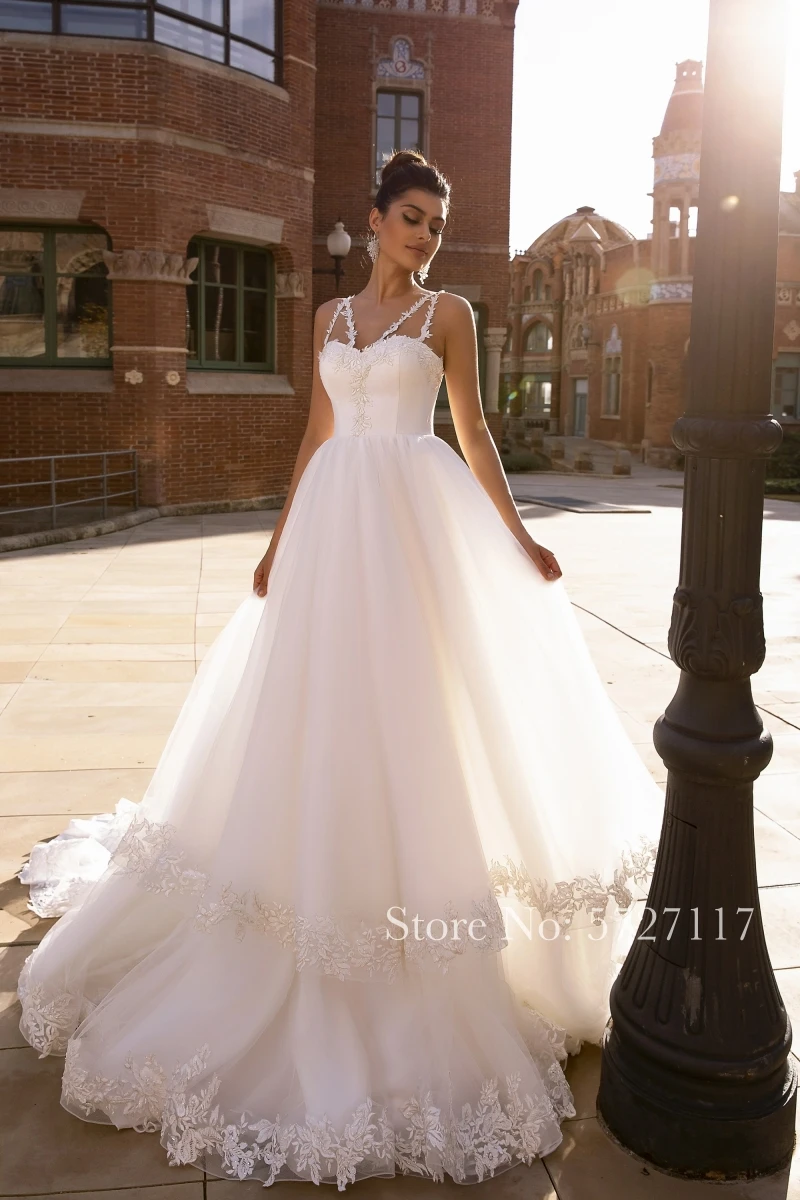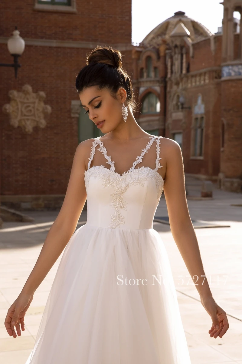 Женское свадебное платье на тонких бретельках, Пляжное ТРАПЕЦИЕВИДНОЕ ПЛАТЬЕ с аппликацией и оборками, свадебное платье со шлейфом