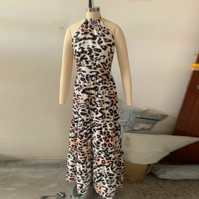 Женское леопардовое Платье макси с лямкой на шее, открытой спиной и без бретелек, летнее сексуальное пляжное платье без рукавов, сарафан, длинные платья для отпуска, 2021