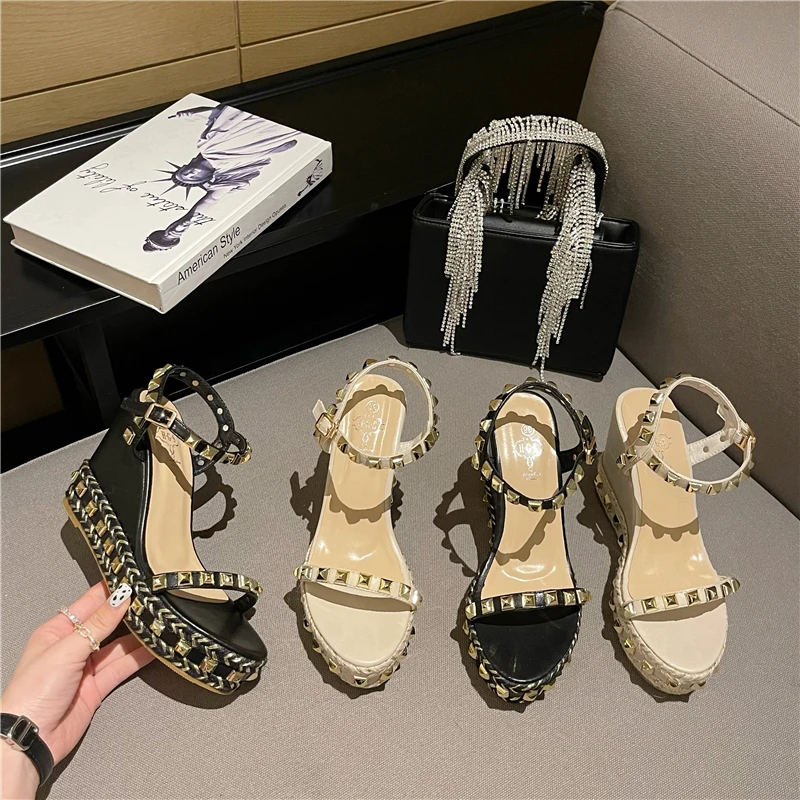 Женские соломенные сандалии на танкетке, лето 2021, женские сандалии на толстой подошве с заклепками, Нескользящие, женские повседневные сандалии, римские сандалии