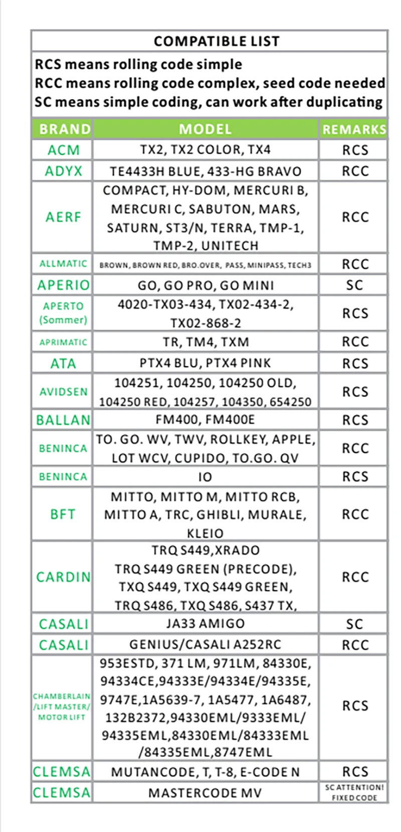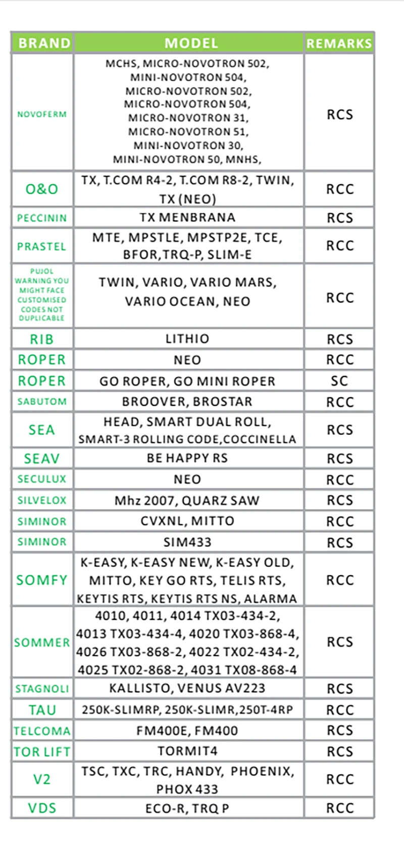 Диапазон частот обучения: 287 МГц, 300 МГц, 306 МГц, 310 МГц, 315 МГц, 315,5 МГц, 330 МГЦ, 360 МГц, 390 МГц, 410 МГц, 430,5 МГц, 433,42 МГц, 433,92 МГц, 868,35 МГц, 286-361 МГц, 384-400 МГц.