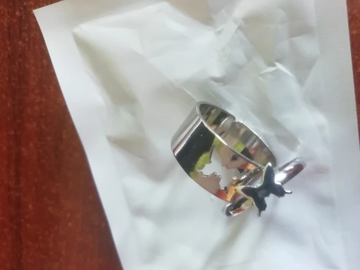 Кольцо точно такое же, как в описании. Гнётся хорошо, можно на любой палец подогнать. По толщине металл больше напоминает прочную жесть, но сюда это подходит как нельзя лучше.