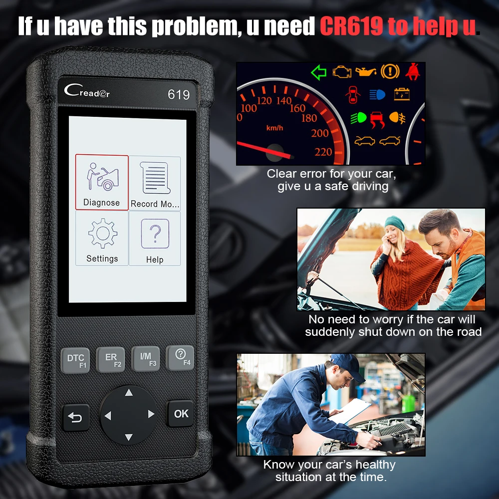 LAUNCH CR619 automoitve компьютерный диагностический сканер считывает или очищает двигатель, ABS (антиблокировочный тормозной датчик) и SRS (подушка безопасности) коды неисправностей, выключает светильник indictor (MIL).Этот сканер OBD2 будет работать на машине, у которой есть стандартный протокол OBD2 (прототипы OBDII и CAN, включая ISO9141 -2, ISO14230-4, SAEJ1850 и ISO15765-4).