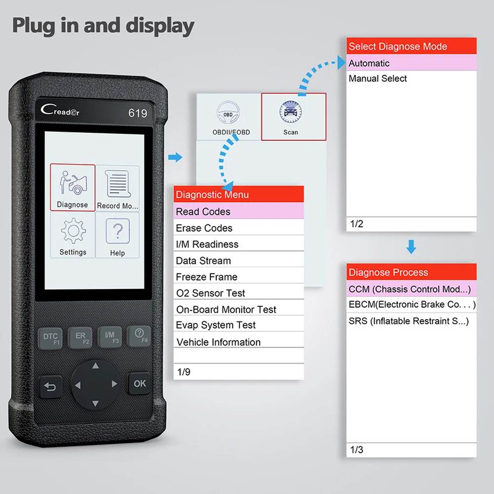 Launch CR619 OBD2 автомобильный диагностический инструмент Основная функция: