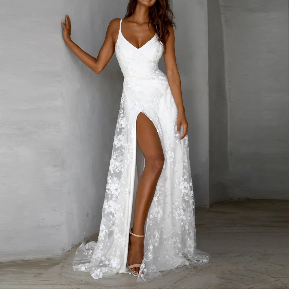 Сексуальные кружевные свадебные платья 2021 летние с высоким разрезом без спинки на тонких бретельках Boho белые цвета слоновой кости пляжные свадебные Платья Vestidos De Noiva