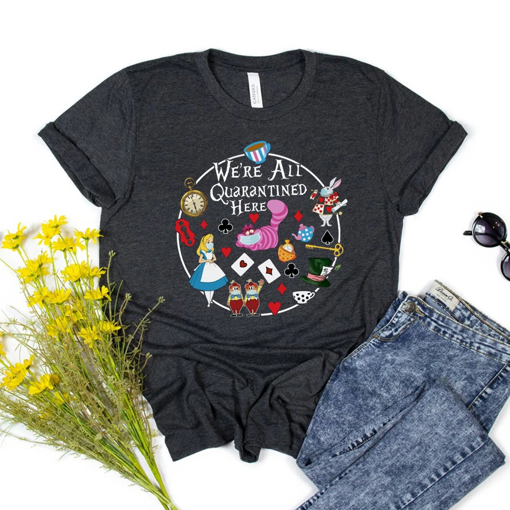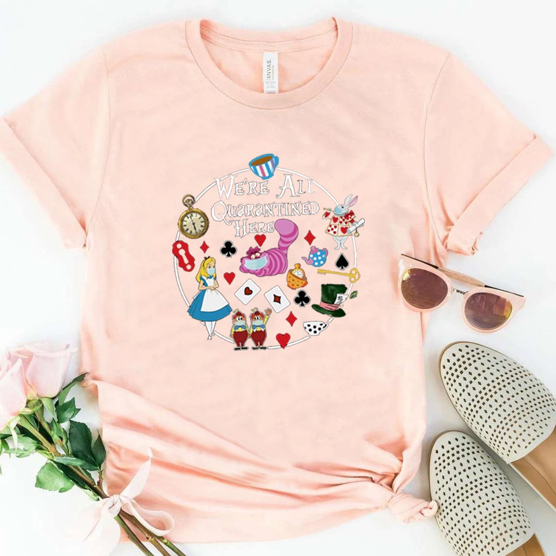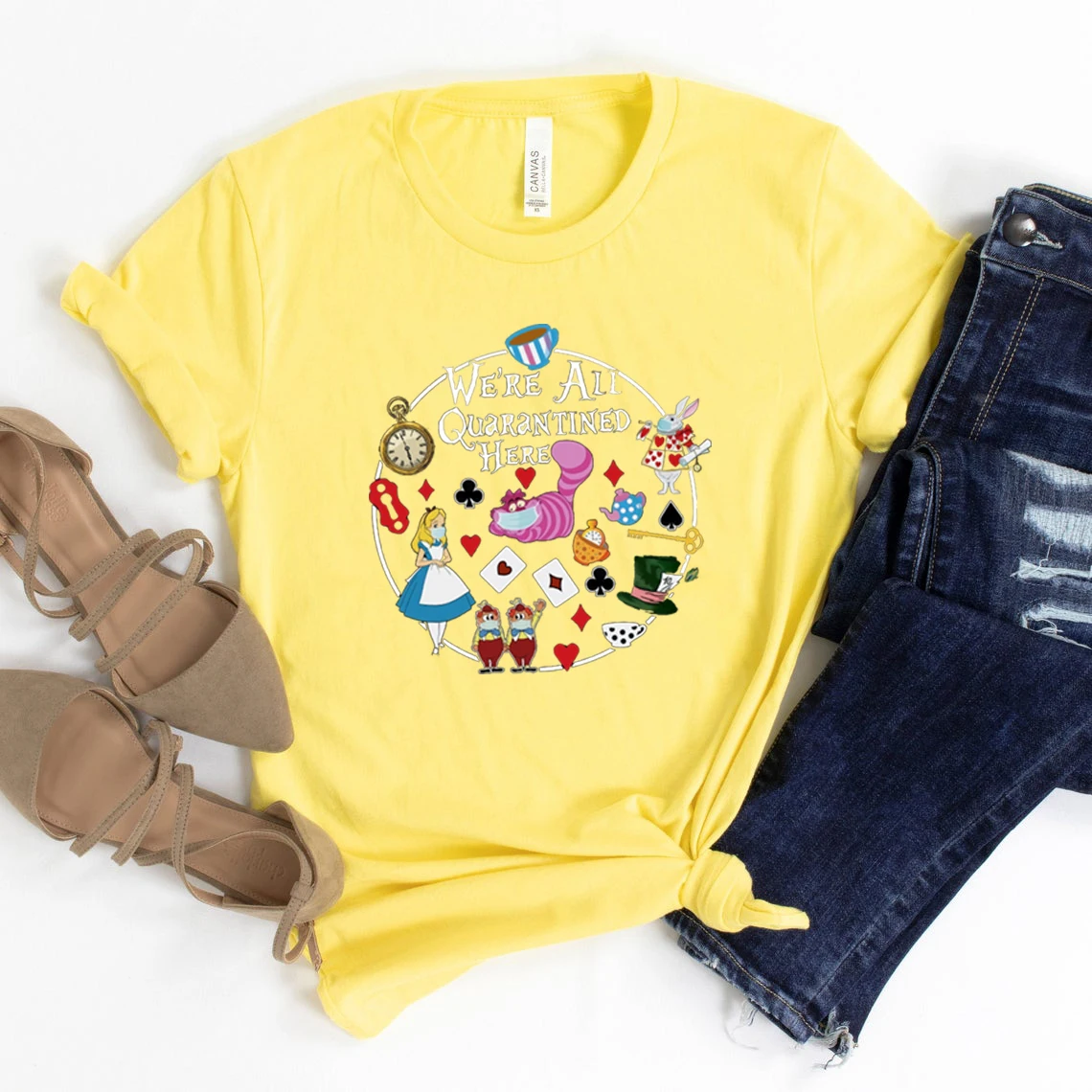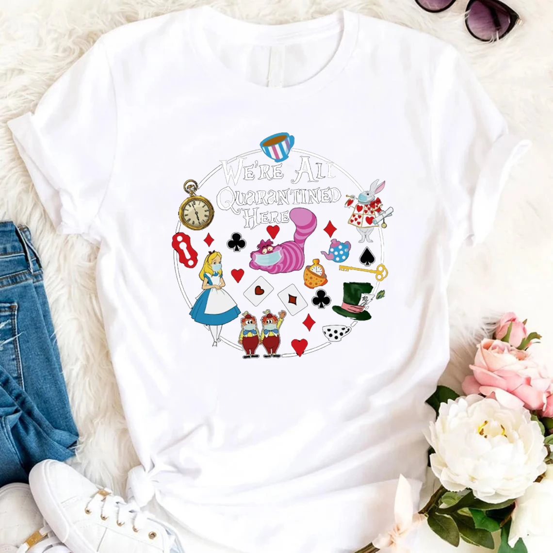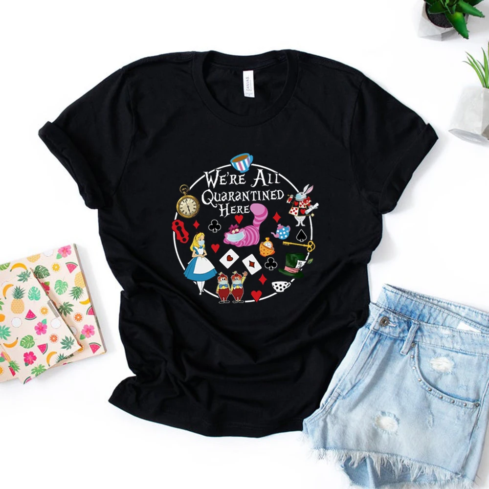 Мы все карантин здесь рубашка Алиса в стране чудес карантин Te смешная карантин футболка Cat White рубашки с кроликом