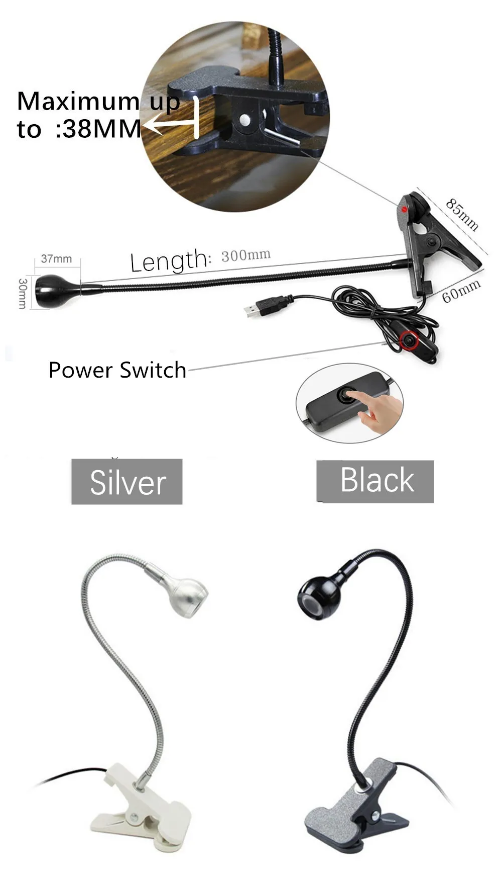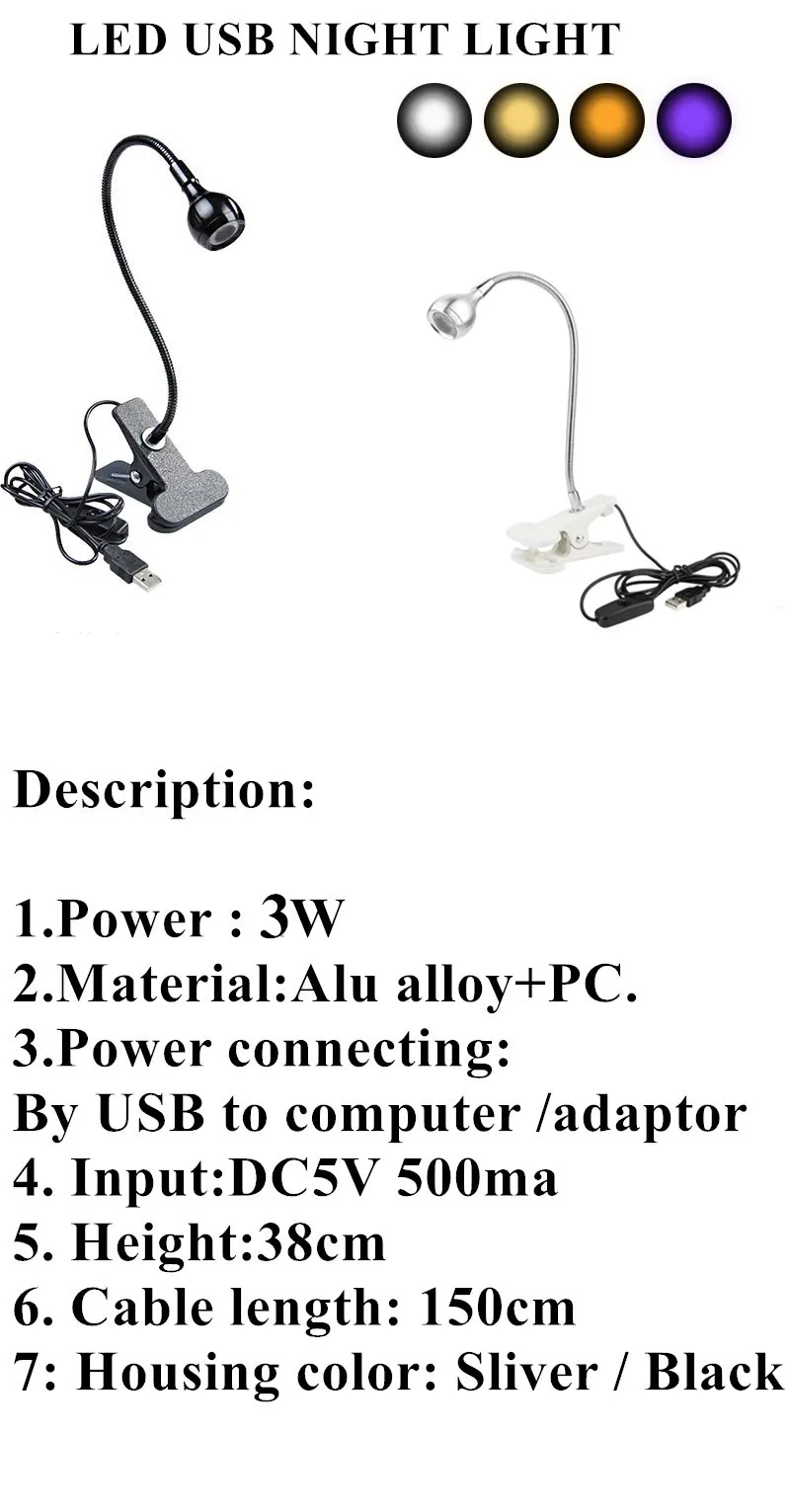 Описание:1. Мощность: 3 Вт2. Материал: сплав Alu + PC.3. Подключение питания:От USBК компьютеру/адаптеру4. Вход: DC3-5V 500 мА5. Высота: 38 см6. Длина кабеля: 150 см7: Цвет корпуса:Серебристый/черный8: цвет освещения: теплый белый/оранжевый/красный/УФ-фиолетовый цвет9. Яркость с регулируемой яркостью или без затемнения на выборХарактеристика: