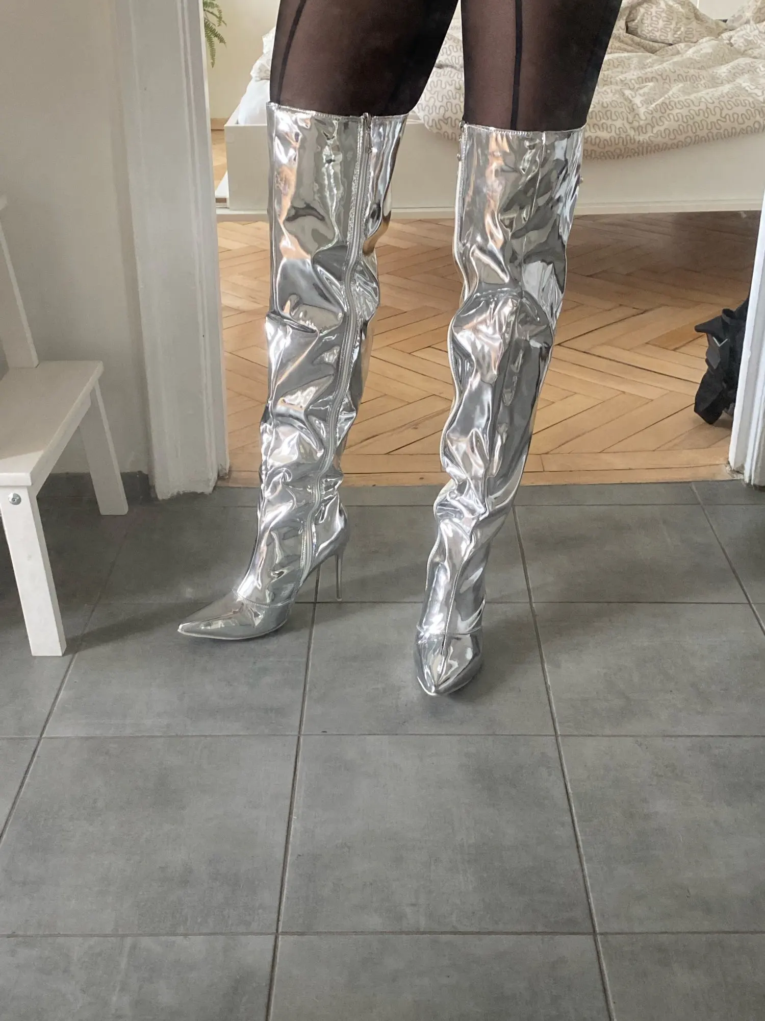 Женские сапоги с зеркальной платформой, с острым носком, в стиле панк, на высоком тонком каблуке, Сапоги выше колена, осенне-зимняя повседневная обувь для вечеринок на молнии серебристого цвета
