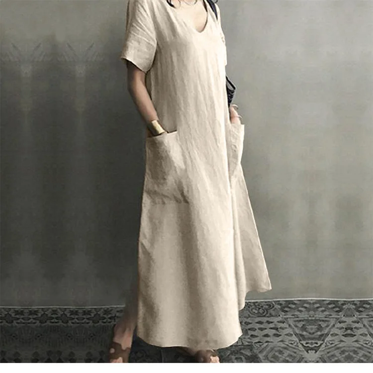 Женское длинное платье-макси из хлопка и льна, с V-образным вырезом
