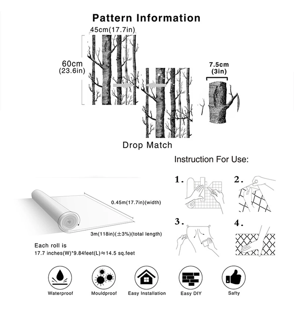 Материал: виниловый пвх самоклеющиеся обои Метрический Размер:(Д) 1 м * (Ш) 45 см = 0,45 квадратных метров рулон(Д) 3 м * (Ш) 45 см = 1,35 квадратных метров рулон(Д) 6 м * (Ш) 45 см = 2,7 квадратных метров рулонИмперский Размер:(Д) 3,28 фута * (Ш) 1,47 фута = 4,82 квадратных футов в рулоне(Д) 9,84 фута * (Ш) 1,47 фута = 14,46 квадратных футов в рулоне(Д) 19,67 футов * (Ш) 1,47 футов = 28,91 квадратных футов в рулоне Особенности:Самоклеящийся, съемный, водонепроницаемый, маслостойкий Использование для:Кухонная стена, стена для ванной комнаты, ремонт мебели, ТВ фон, дом, кофейня