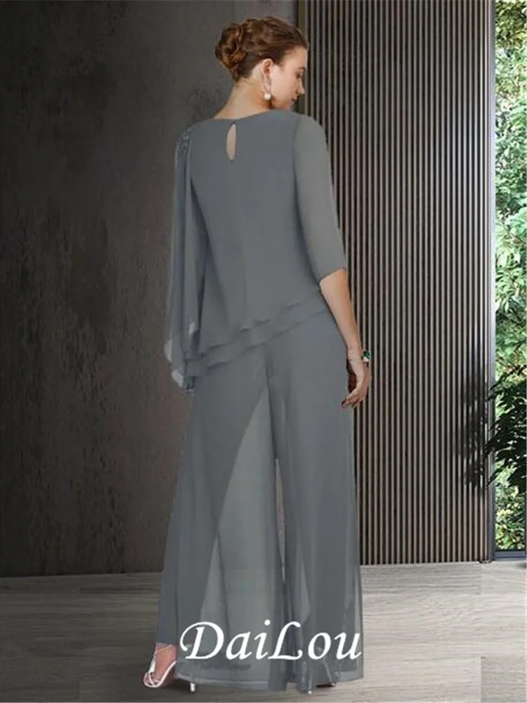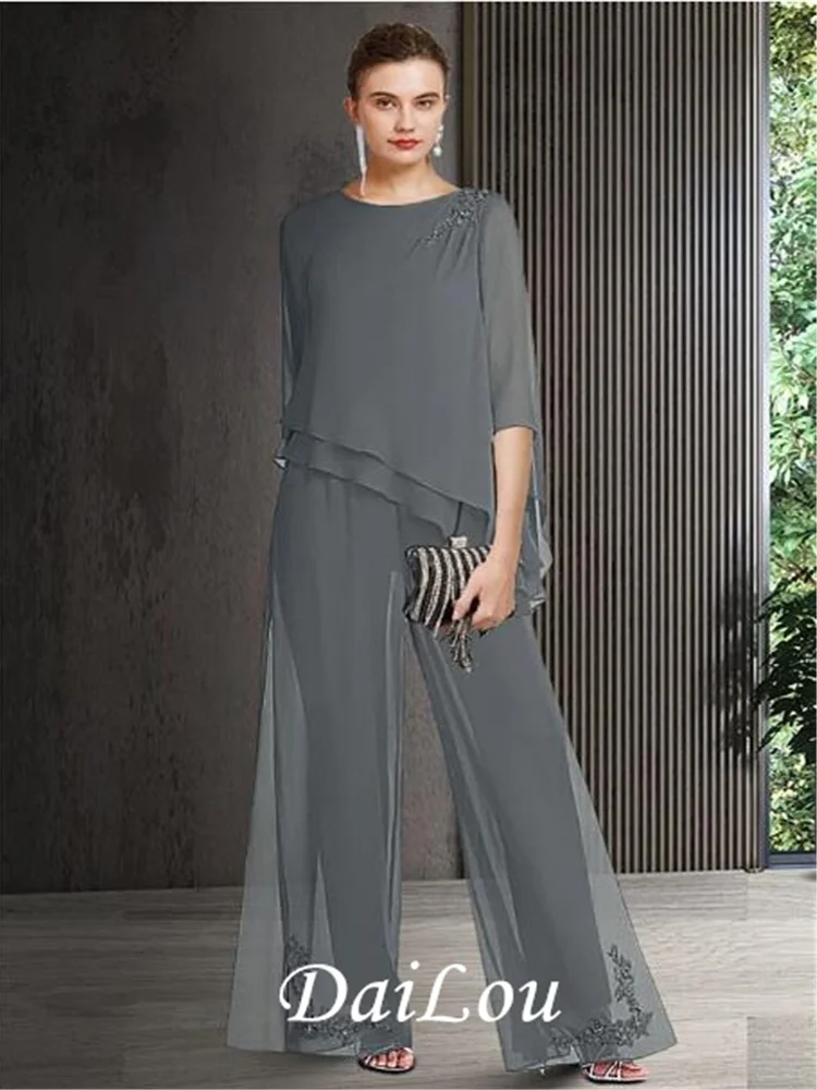 Элегантный шифоновый костюмкомбинезон для матери невесты, с круглым вырезом, длиной до пола, рукавом до локтя и аппликацией, 2022