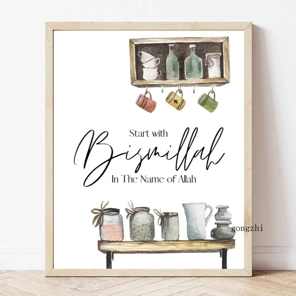 Начните с Bismillah конец с Alhamdulillah Исламской плакат акварельная картина на холсте принты Кухня настенные картины Декор для дома