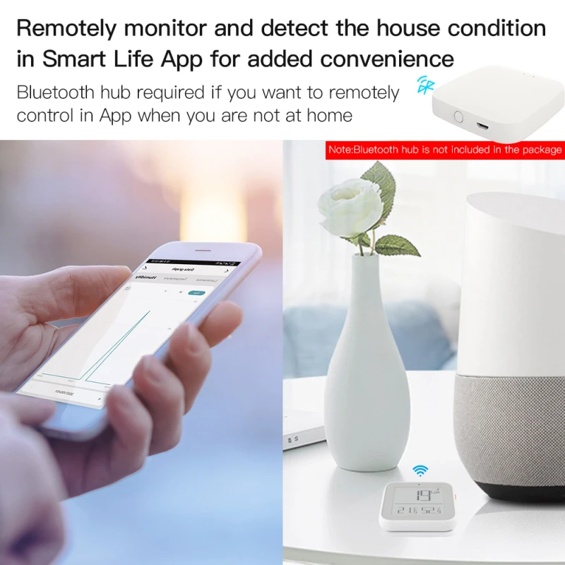5. Концентратор шлюза Bluetooth является обязательным для этого датчика температуры и влажности яркости Bluetooth, когда требуется Беспроводное дистанционное управление, и не требуется концентратор, когда только для сопряжения в приложение, показан в качестве центра управления для умных домов. (Bluetooth-концентратор не входит в посылка.)