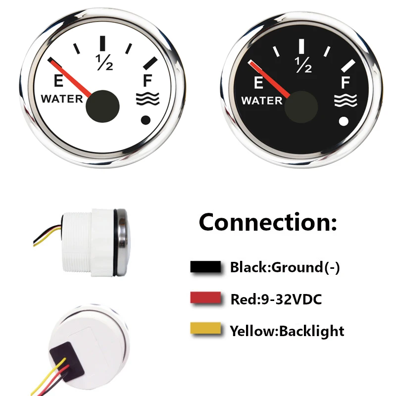 Выходной сигнал: 0 ~ 190 Ом (стандартный европейский)Водонепроницаемая, противотуманная и интеллектуальная функция сигнализацииЕсли уровень топлива или воды превышает 13%, загорается предупреждающий светильникПодсветка: красныйВодонепроницаемость: IP67Размер крепления: 52 мм (2 '')-Рабочее напряжение: 9-32 В