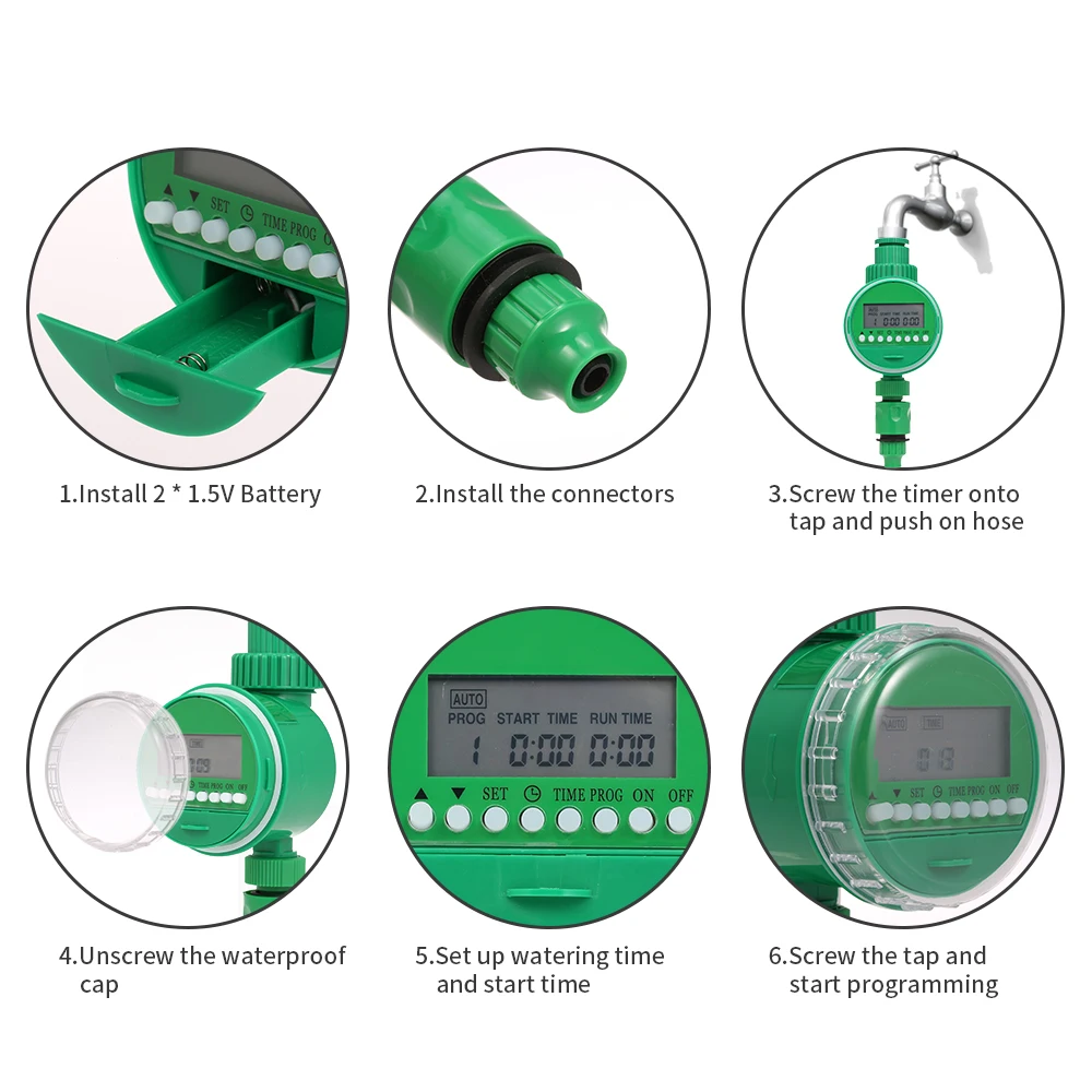 Описание: Этот таймер отличается простой, простой установкой и программированием. Нет необходимости в инструментах. Просто установите время начала, продолжительность полива и частоту. Большой, легко читаемый ЖК-экран облегчает программирование. Больше нет мертвых растений или туманных газонов, потому что вы забыли их поливать. Особенности: Самый длинный период может быть установлен один раз в 30 дней, время полива может быть точным до 1 минуты, до 9 часов 59 минут. Большой ЖК-экран с индикатором низкого заряда батареи показывает состояние орошения и стандартное время/день. Переключатель ручного переопределения для сохранения программирования и обеспечения гибкого ручного полива. Подходит для крана: 1/2 "или 3/4" снаружи нити, удовлетворяет различные потребности. Мощность 2*1,5 V щелочные батареи Ni-MH, нет необходимости в проводке. Характеристики: Цвет: зеленый Мощность: 2*1,5 V щелочные батареи (не входит в комплект) Подходит для крана: 1/2 "или 3/4" снаружи резьбы. Рабочее давление воды: 0.1MPA-0.6MPA Рабочая температура: 0-60 ℃ Поток: 600-800л/ч Материал: АБС-пластик Посылка Размеры: 12,5*12*10 см/4,9*4,7 * 3.9in Вес посылка: 303 г/10,7 унций Примечание: 1. Таймер контролирует только поток воды, это не увеличит давление воды. 2. Пожалуйста, тщательно очистите фильтр. 3. Меняйте аккумулятор каждые 6 месяцев, чтобы убедиться, что он хорошо работает. Посылка: 1*1/2 "соединитель водопроводной воды 1*3/4 "соединитель водопроводной воды 1 * панель управления 1 * быстроразъемный разъем