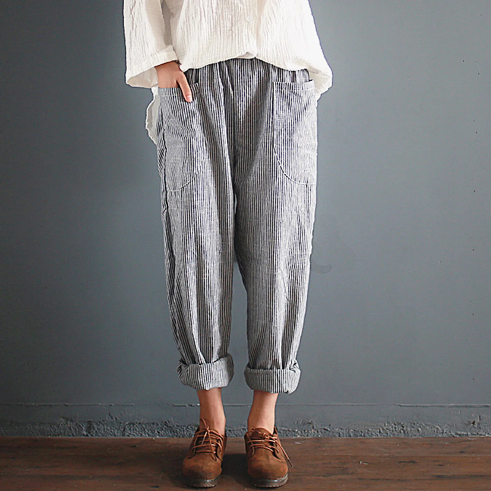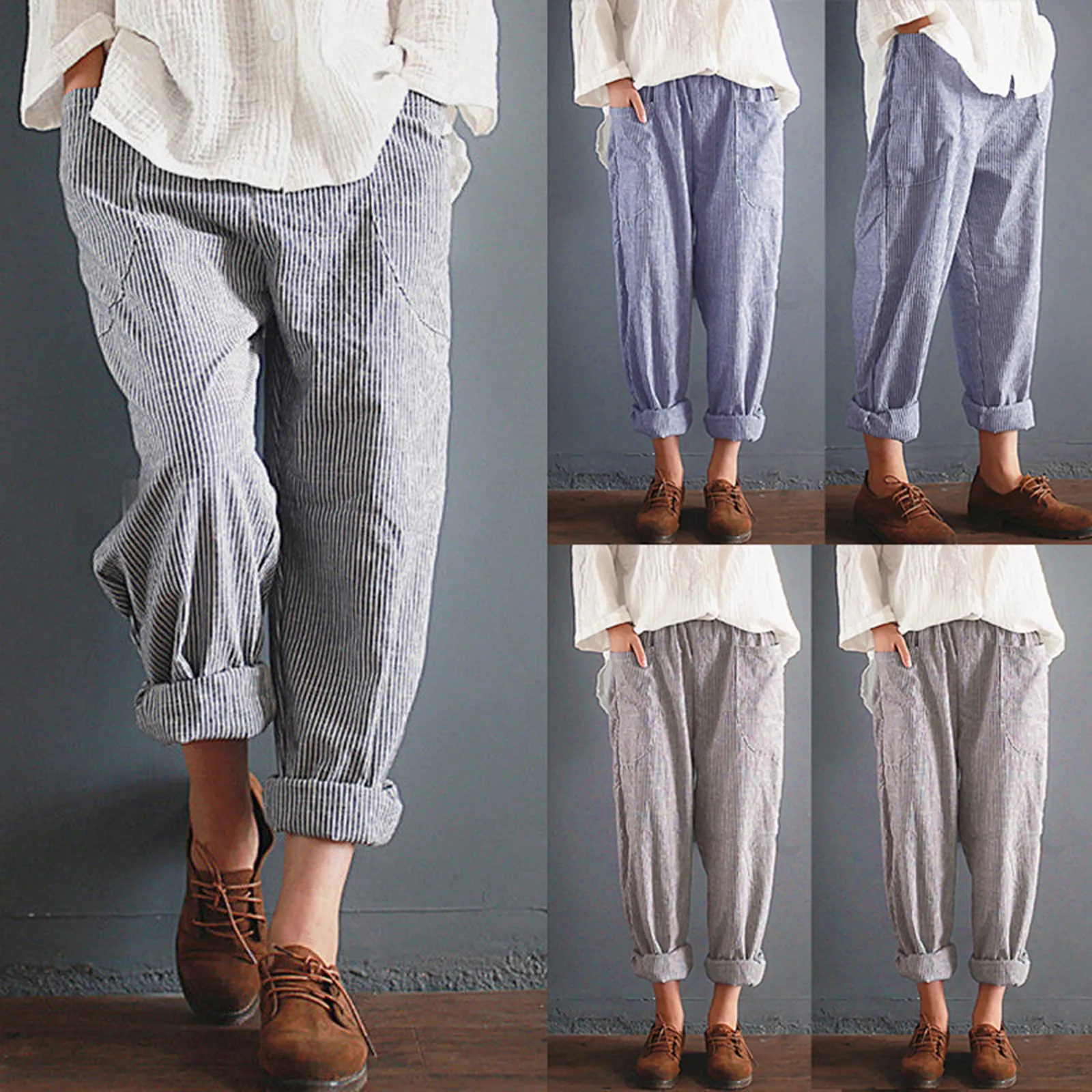 Брюки-султанки женские из размера плюс хлопка и льна, свободные штаны с завышенной талией, в полоску, повседневные брюки с карманами, спортивные, на лето