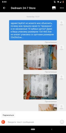 заказал/оплатил набор из 10 зубных щеток.... Через 3 дня продавец отправил, трек-код предоставил... Через 4 дня смотрю: заказ пришёл... Забираю заказ, смотрю упаковка явно не по размеру щёток: в описано товара размер 23х20х2см, получил упаковку размером 13х14х0.3см... Под видео открыл упаковку, а там какая-то копеечная резинка для волос.. Пишу продавцу... Тот советует открыть спор... Открываю спор... Вот если бы под видео не распаковывал товар, то спор был бы не в мою пользу: сказали бы что сам подменил товар... ВЫВОД: продавец МОШЕННИК, обманывает, на покупателей ему наплевать... Не советую заказывать товар у этого "продавца"....