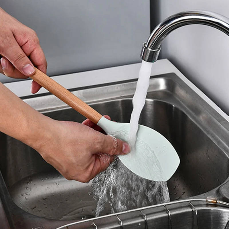 Защита окружающей среды, нетоксичный, термостойкий, антипригарный, прочный, безопасный, легко чистится продукты для кухонной посудыПодходит: микроволновая печь, тостер, пароварка, можно варить и стерилизовать.Материал: силикон + дерево из натуральной акацииЦвет: зеленый, серый, розовый, мятно-зеленый, красный