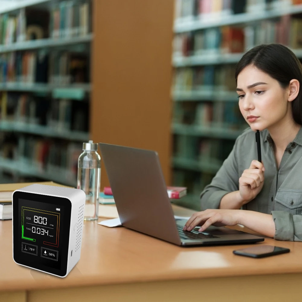 * 3. Цветной экран: отображение текущей информации о CO2, данных о температуре и влажности. Цветное кольцо изменится в зависимости от содержания CO2.