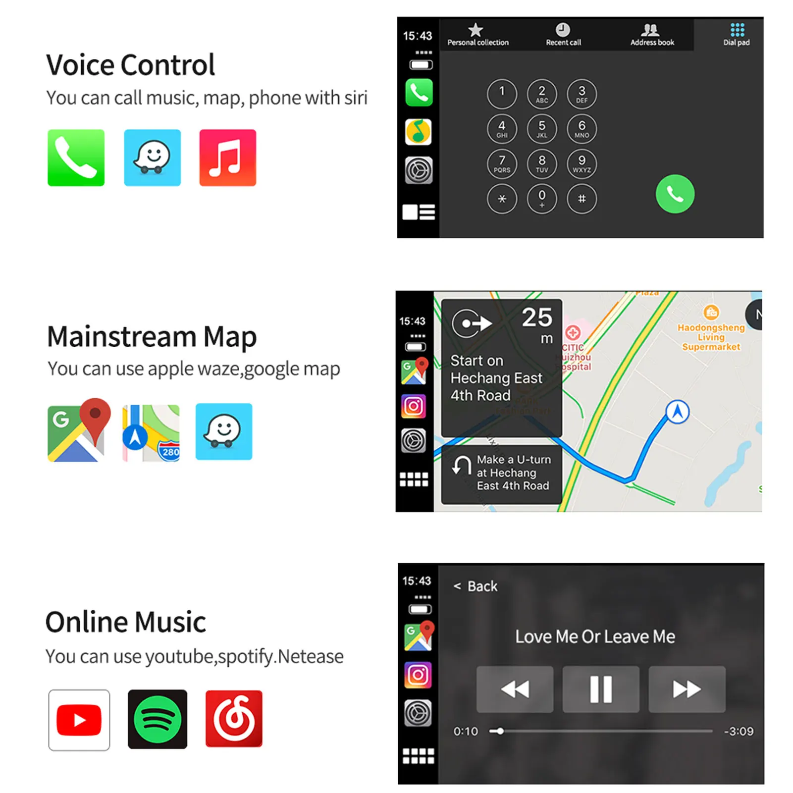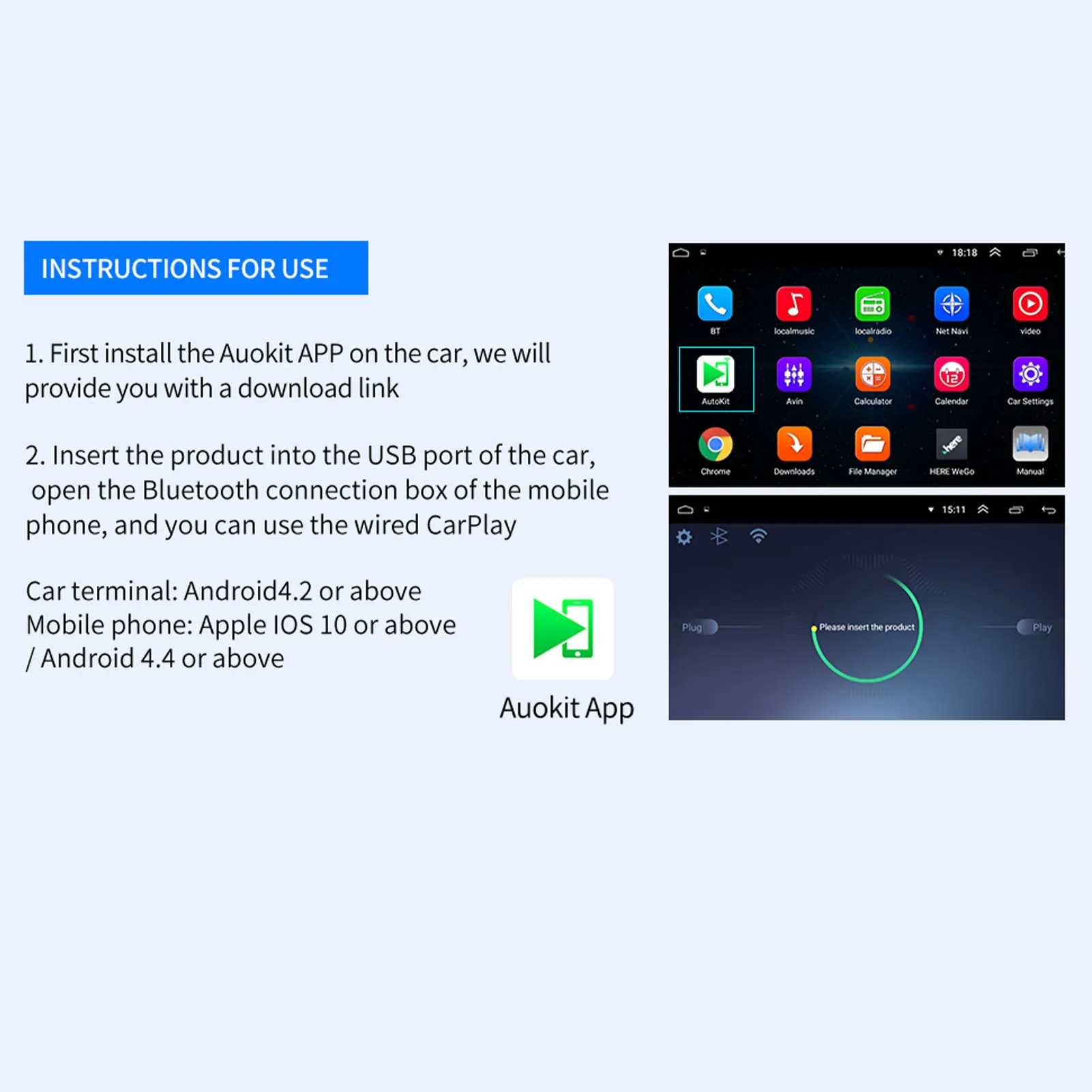 Особенности:1. Голосовое управление: Поддержка Siri / music / maps/телефонных звонков/сообщений/аудиокниг. Функция Siri поможет вам позвонить по телефону или любому из ваших друзей. Пожалуйста, обратите внимание, что скорость работы нашего устройства зависит от скорости вашего телефона ios.2. Сенсорный экран и HD-дисплей: управление направлением и просмотр телефона на экране автомобильной навигации с помощью USB-кабеля.3. Вождение без помощи рук и безопасное: совершайте/отвечайте на звонки, проверяйте голосовую почту, текстовые сообщения и воспринимайте карты.Слушайте любимые песни с помощью iTunes, музыки или установленных приложений для свободных рук.Характеристики:Как установить APK на Android car?Адрес загрузки: http:// 121.40.123.198:8080/autokit/autokit)1. Подготовьте USB-накопитель, загрузите файл APK на USB-накопитель(QR-код посылка вке также является адресом загрузки).2. Вставьте USB-накопитель в USB-порт навигационной машины, найдите меню управления файлами, выберите файл APK для установки. После установки навигационный интерфейс выходит со значком.3. Подключите наш ключ к USB навигации, затем подключите кабель для передачи данных вашего мобильного телефона (было бы лучше оригинальный заводской кабель для мобильного телефона), подождите несколько секунд, чтобы подключиться.Как обновить этот продукт?1. Сначала введите настройки CarPlay.2. Выберите проверку обновлений.3. А затем выберите версию программного обеспечения, сначала версию обновления программного обеспечения.4. Выберите версию коробки (прошивка), обновите ее, затем на фотографиях появится интерфейс навигации 4.5. Навигация будет происходить на фото 5/6.Совместимые устройства:Для iPhone с iOS (7,1 и выше)Для мобильных телефонов Android (5,1 и выше)Автомобильные стереосистемы с версией android (4.4.2 и выше)(Продукт поддерживает большинство телефонов Android market, но не на 100% поддерживает все телефоны Android и Авторадио Android)Как использовать продукт:1. Установите APK для продукта в автомобильное головное устройство Android.2. Подключите устройство к USB-порту автомобильной головной магнитолы Android.3. Сопряжение и подключение Bluetooth iPhone с автомобильным Bluetooth (для iPhone также поддерживает подключение через USB-кабель); Для телефонов Android по-прежнему необходимо подключение через USB-кабель.4. Экран автомобиля войдет для интерфейса CarPlay.Упаковочный лист:Модуль для CarplayПримечание:1. Оригинальный экран автомобиля не поддерживается, этот продукт работает только с экраном системы Android.2. Этот продукт поддерживает 99% штатное устройство Android на вторичном рынке и 99% для iPhone/телефонов Android.3. Этот продукт плохо работает на автомобилях Win-CE.4. Установите APK перед покупкой, чтобы узнать, удастся ли установить.Http: // 121.40.123.198:8080/AutoKit/autokit)5. Продукт поддерживает обновление прошивки, один год гарантии.6. Сначала установите APK for, чтобы посмотреть, удастся ли установить.Если установка прошла успешно, это устройство поддерживает ваш автомобиль7. Если установка не удалась, товар не совместим с вашим автомобилем(Оригинальный экран автомобиля не поддерживается, этот продукт работает только с экраном системы Android)8. Этот продукт не совместим с оригинальным заводским автомобильным экраном.9. Этот продукт поддерживает 99% вторичного рынка для головного устройства Android и 99% для iPhone/телефонов Android.10. Этот продукт плохо работает на автомобилях Win-CE.